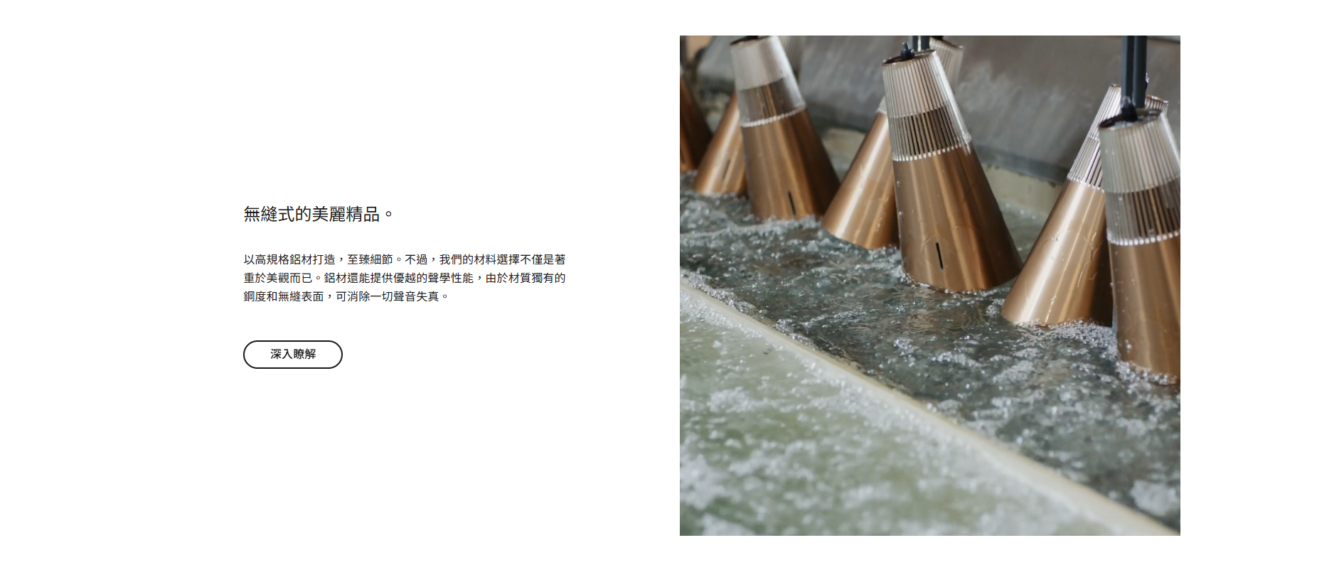 機身由高級鋁合金一體成型,結合 Acoustic Lens Technology 聲波透鏡技術,無論擺放在室內任何角落都能均勻擴散澎湃音效。