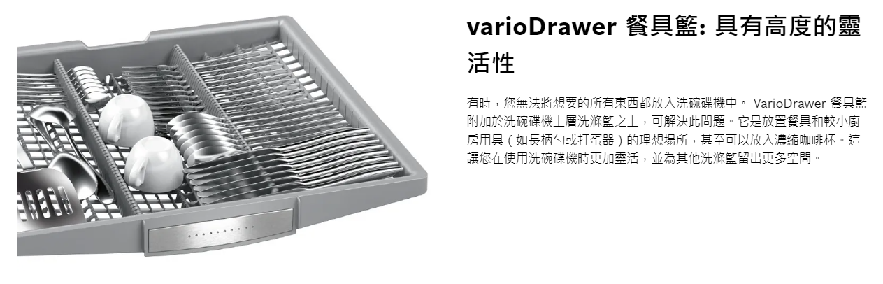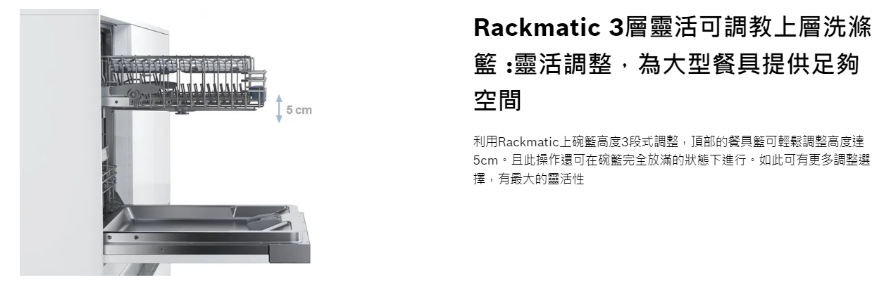 Rackmatic 3層靈活可調教上層洗滌籃 :靈活調整,為大型餐具提供足夠空間