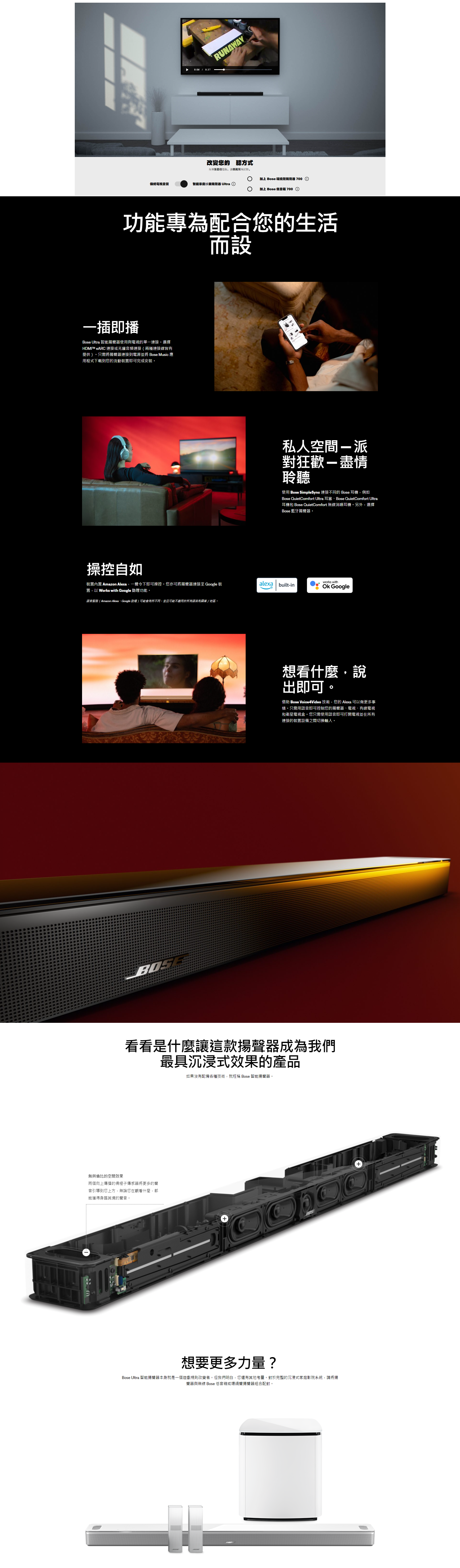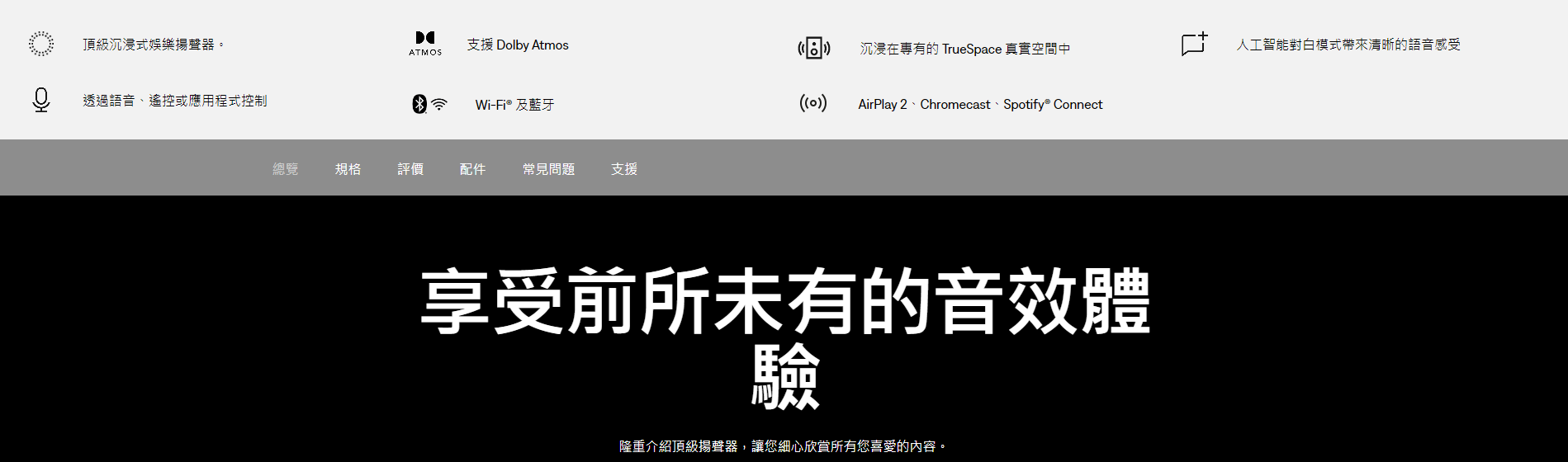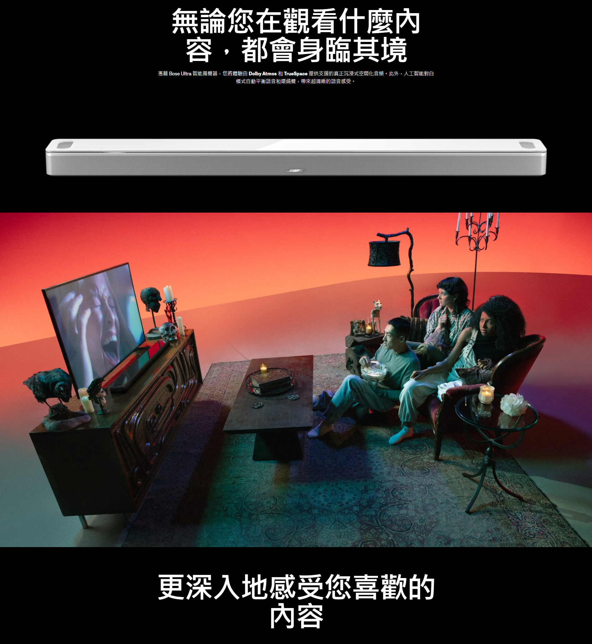 憑藉 Bose Ultra 智能揚聲器,您將體驗由 Dolby Atmos 和 TrueSpace 提供支援的真正沉浸式空間化音頻。