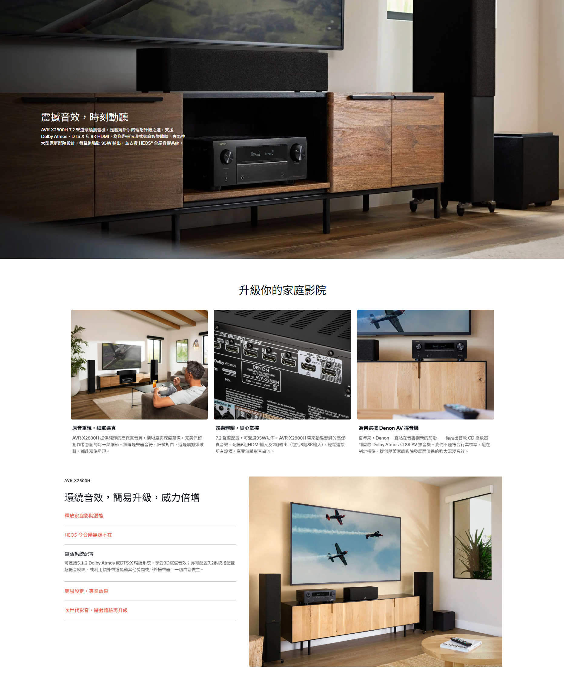 電視/投影雙修玩家必備!⭐現金再特價⭐ DENON 天龍 AVR-X2800H 7.2 聲道 8K AV 擴音機,為中型影音空間提供極致的 3D 沉浸式體驗。每聲道提供高達 150W 強大推力,完美支援 5.2.2 Dolby Atmos 及 DTS:X 全景聲。特設雙 HDMI 輸出及遙控器專屬切換鍵,完美迎合雙螢幕玩家。全面支援 8K/60Hz 及 4K/120Hz,配合全新高清 GUI 介面及 Web UI 網頁設定,操作更直觀靈活。於 HD Life 選購,尊享⭐全新行貨 , 原廠兩年保養 ,⭐免費送貨 (偏遠地區除外)