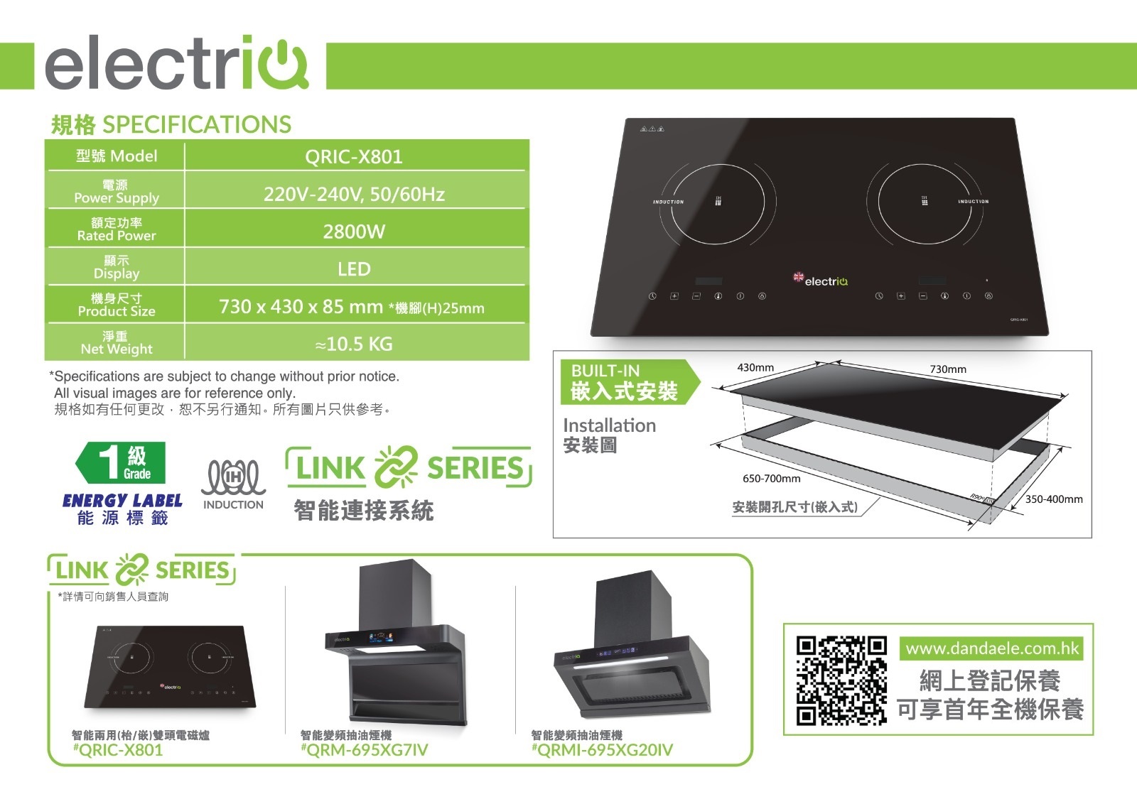 electriQ QRIC-X801 智能兩用座檯/嵌入式 73CM 雙頭電磁爐 electriQ Induction Cooker