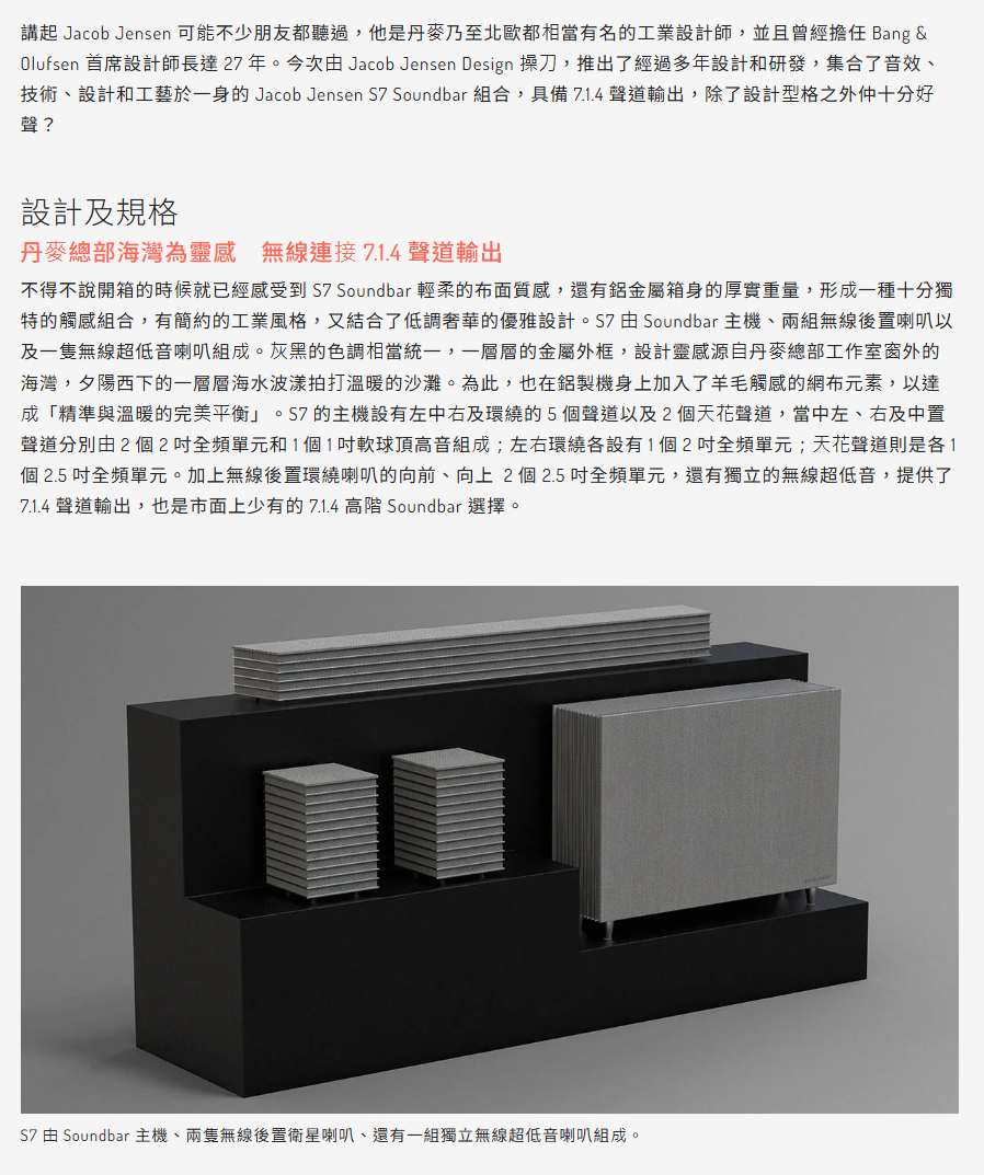 丹麥音響代表 Jacob Jensen S7 Dolby Atmos 7.1.4 Soundbar,由前 B&O 設計師創立,設計簡美而又有不錯的音色表現。