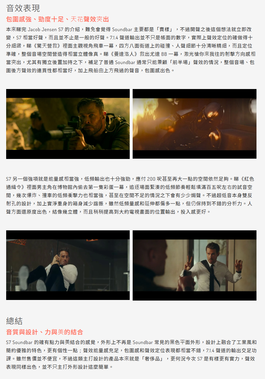 S7 的主機設有左中右及環繞的 5 個聲道以及 2 個天花聲道,當中左、右及中置聲道分別由 2 個 2 吋全頻單元和 1 個 1 吋軟球頂高音組成;