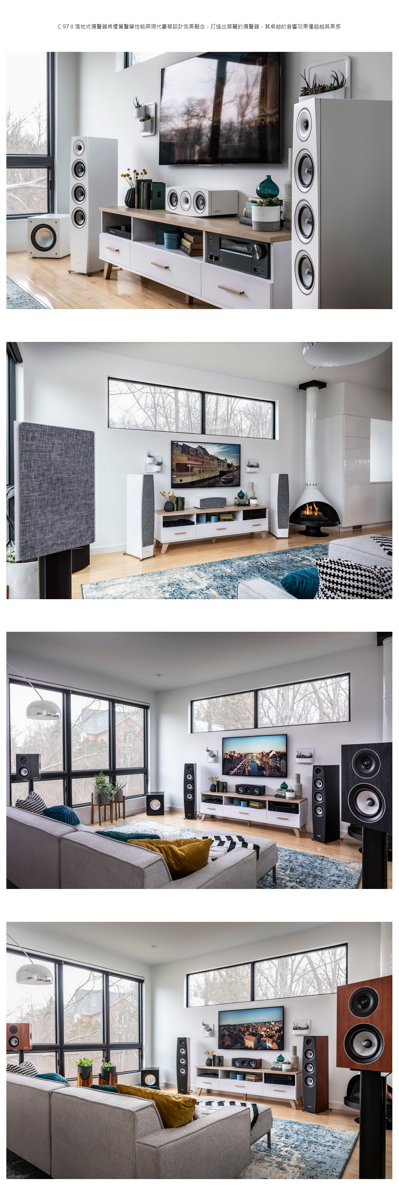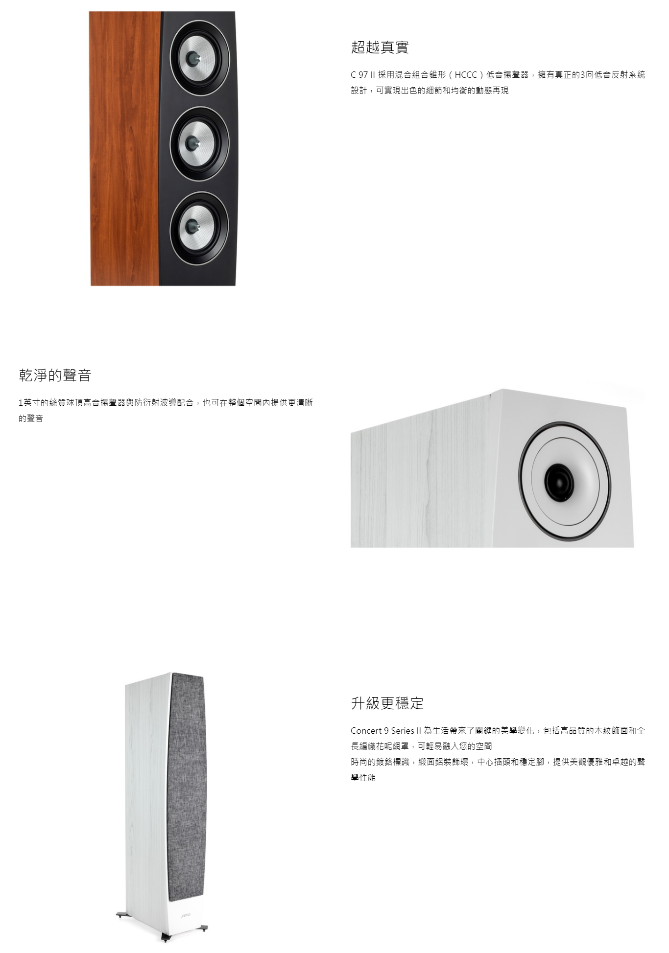 丹麥 Jamo 旗下 C 系列進化到第二代,以主力落地喇叭 C 97 II 來說,維持 3 音路 4 單體設計,強調更為乾淨清晰的音色,並且提升聲波擴散性,即便不在皇帝位,也能聽到寬闊的音場。