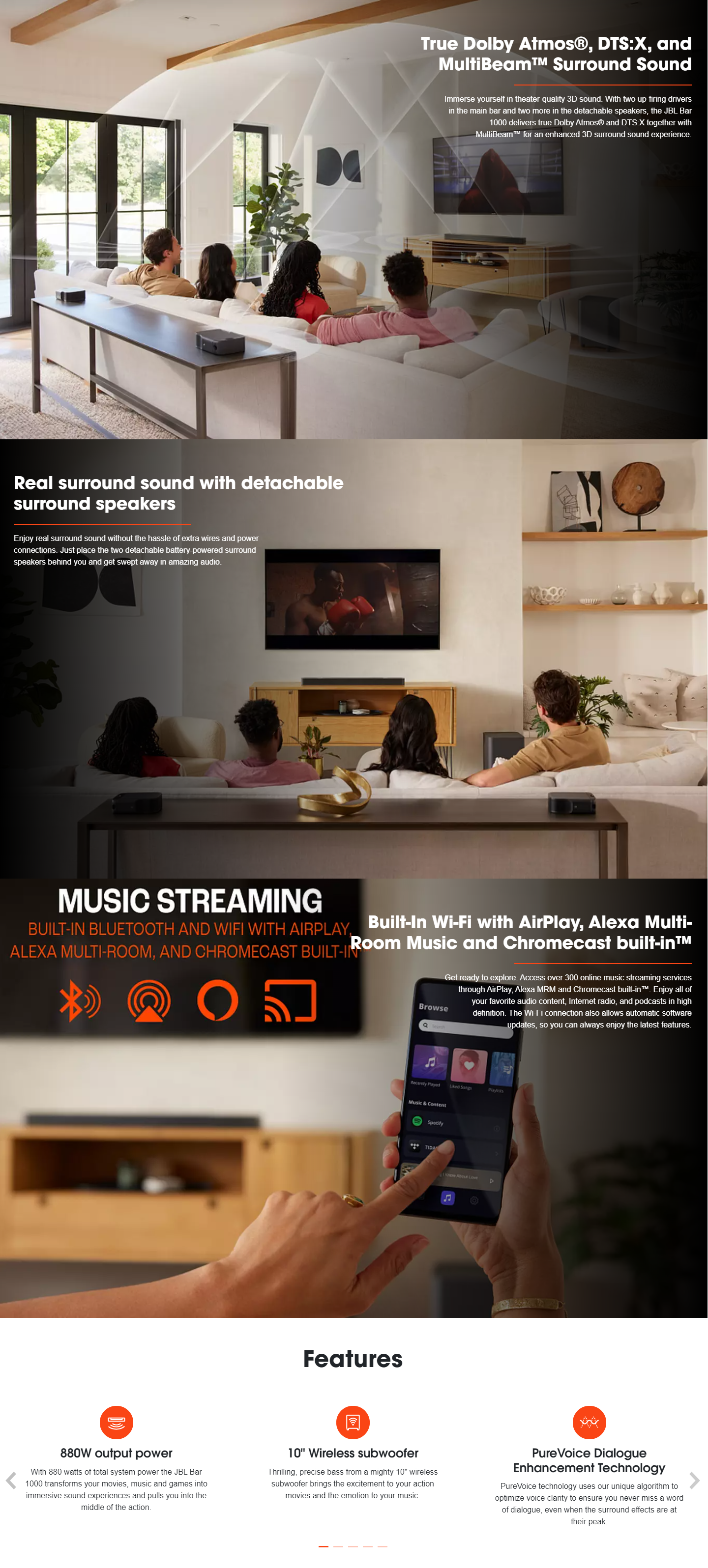 JBL Bar 1000 擁有 880 瓦的總系統功率,讓您的電影、