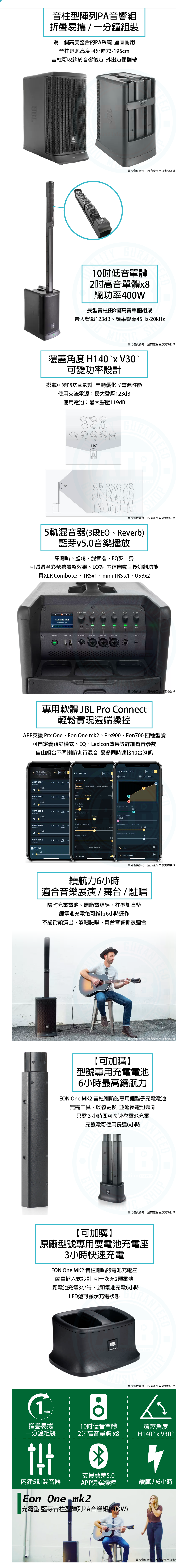 JBL EON ONE MK2 一體式座地喇叭專為流動演出、活動及專業音響需求而設,最大賣點是內置充電電池,