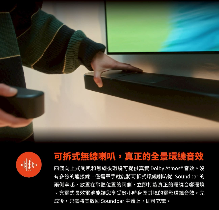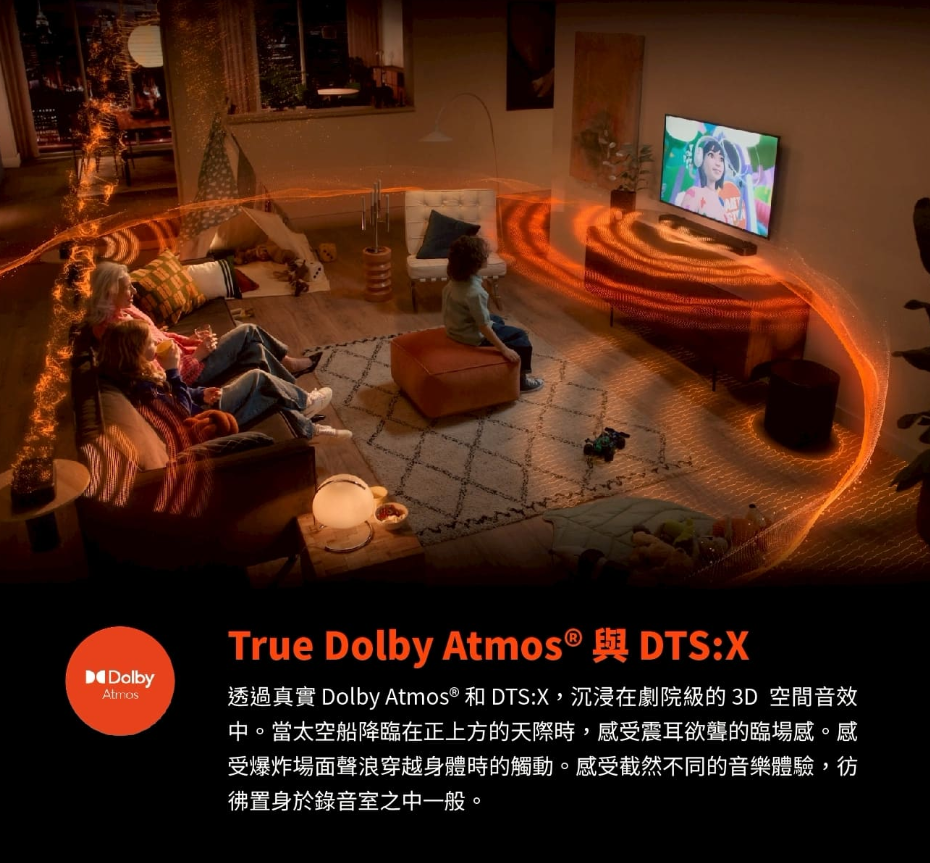 原廠配備可拆式無線環繞喇叭,組合靈活,輕鬆實現360度杜比全景聲及DTS:X立體音場。整機最大輸出達960W,
