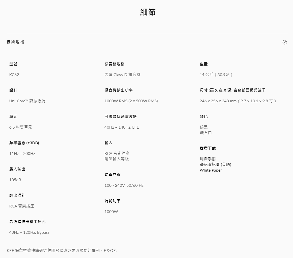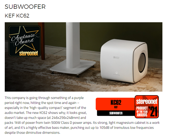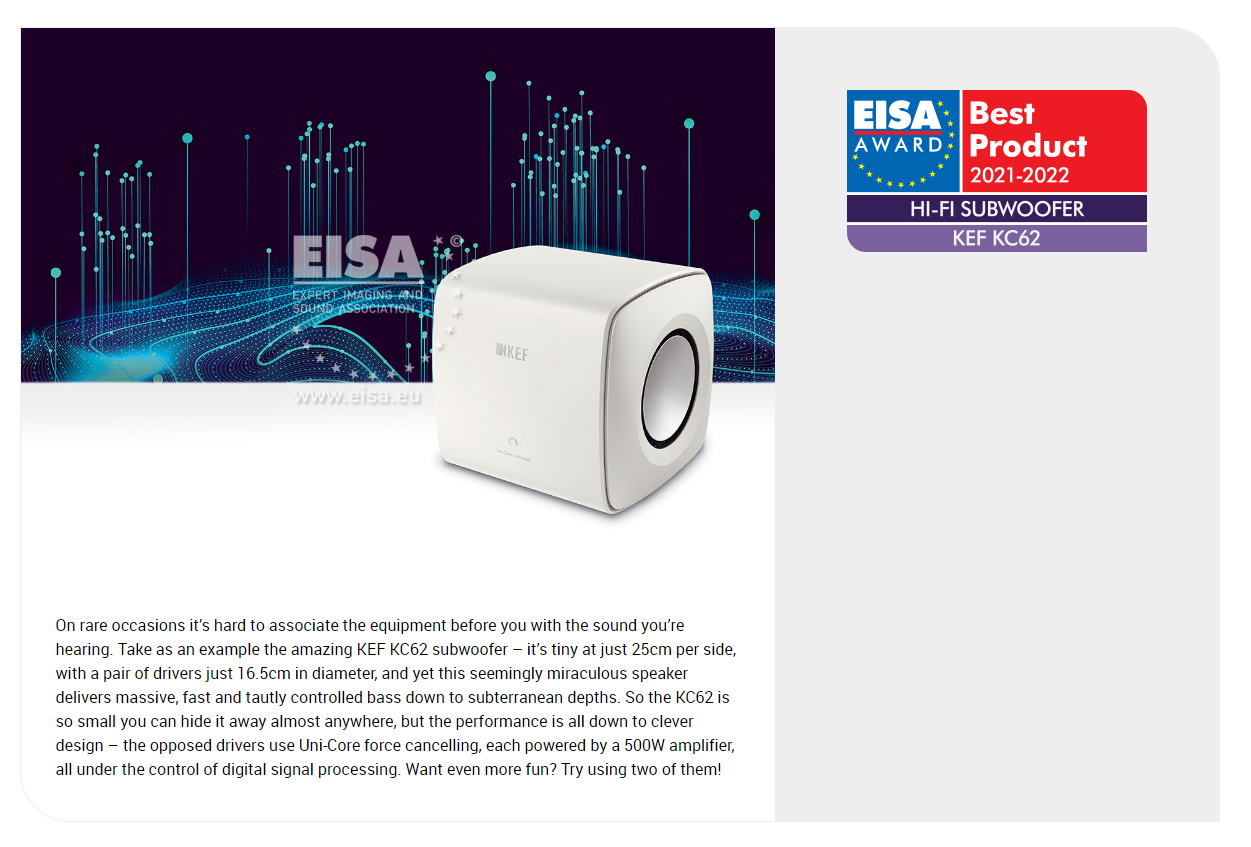KEF KC62 是一款外型小巧,威力十足的超重低音揚聲器,其深沉渾厚、精準細膩的低音表現,