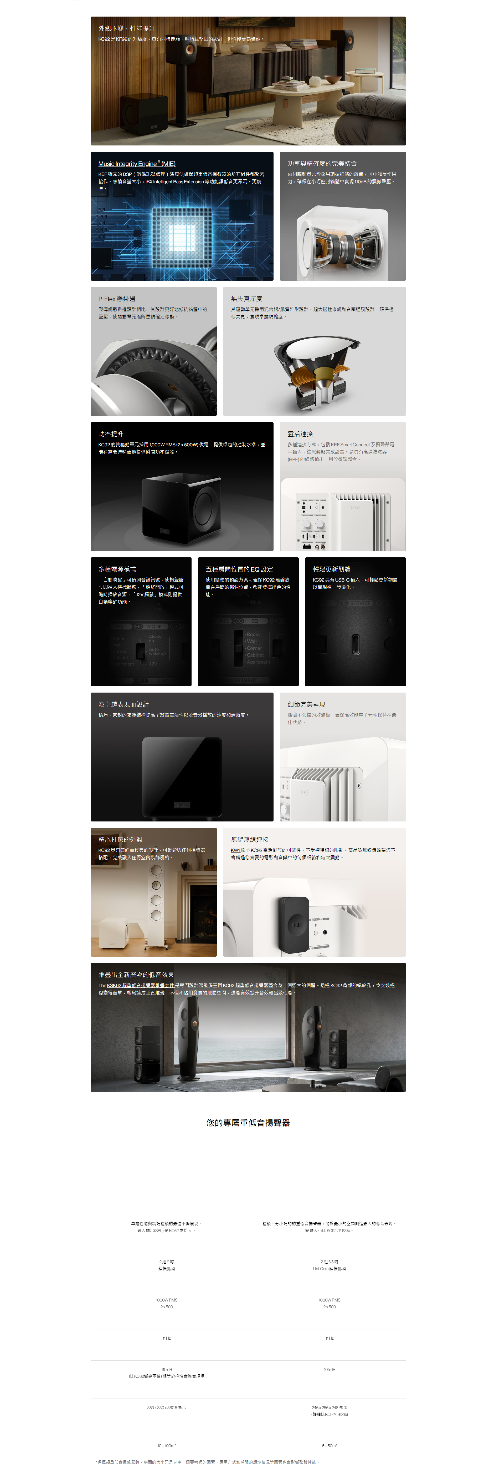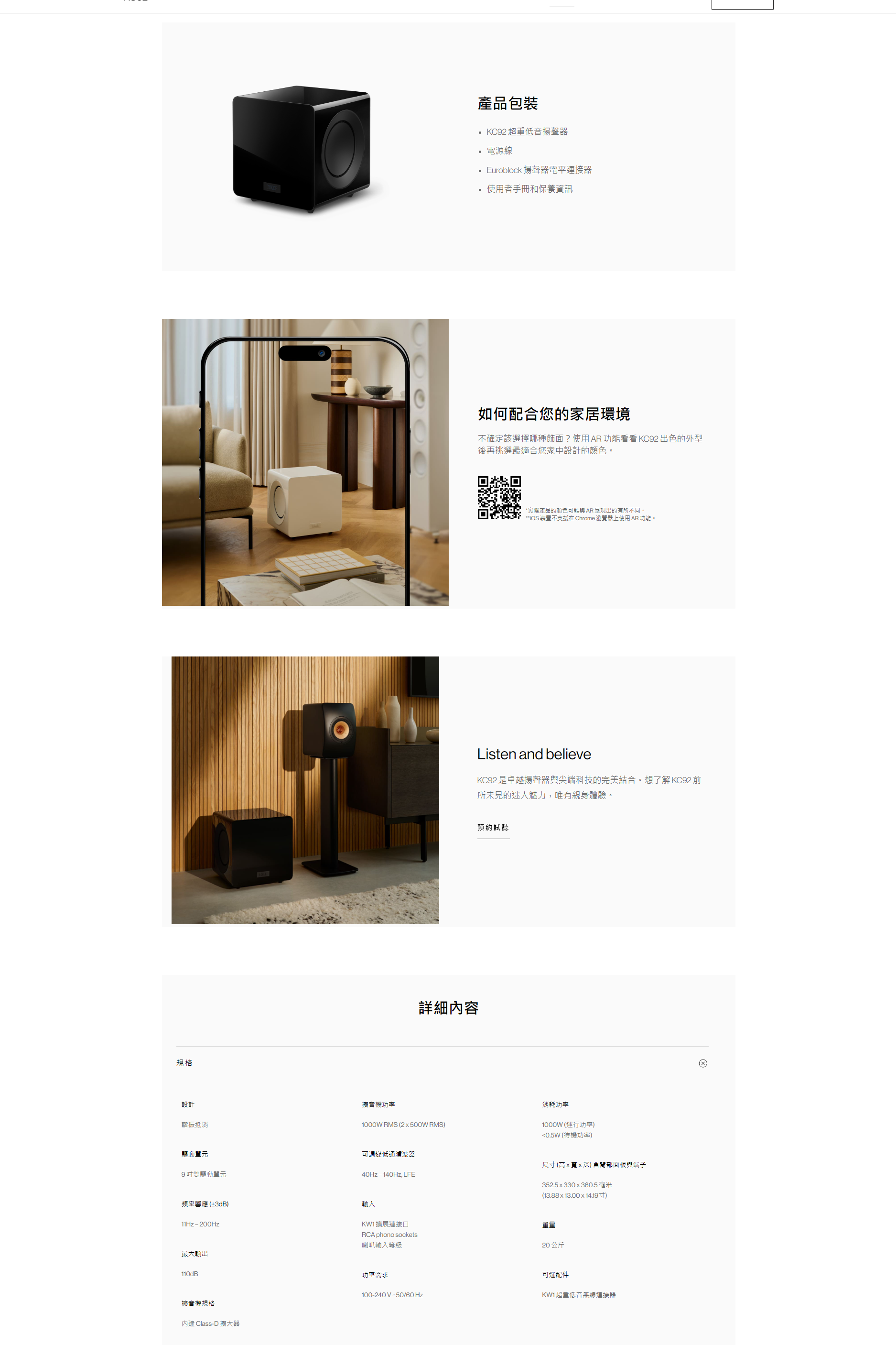 KEF KC92 超低音重磅登場!這款1000W雙 9吋超重低音揚聲器,採用獨特的智能均衡技術和革命性的背對背單元設計,完美消除箱體震動,呈現純淨低頻。強勁的1000W功率輸出,配合KEF獨家 Music Integrity Engine™(MIE) KEF 的 DSP(數碼訊號處理)演算法確保超重低音揚聲器的所有組件都緊密協作。讓您感受電影動作場面的震撼和音樂低音的層次感。緊湊的箱體設計搭配啞光黑色外觀,完美融入任何家居環境。讓您體驗極致的低音震撼!