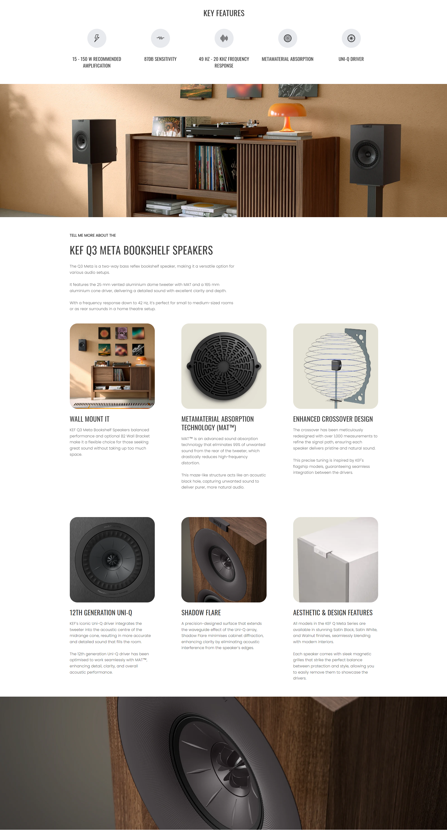 Q3 Meta KEF 設計精巧時尚,提供精確的音效表現,搭載 6.5 吋第 12 代 Uni-Q 同軸共點單元和 MAT™ ,讓你每次都能享受純淨清晰的聲音。