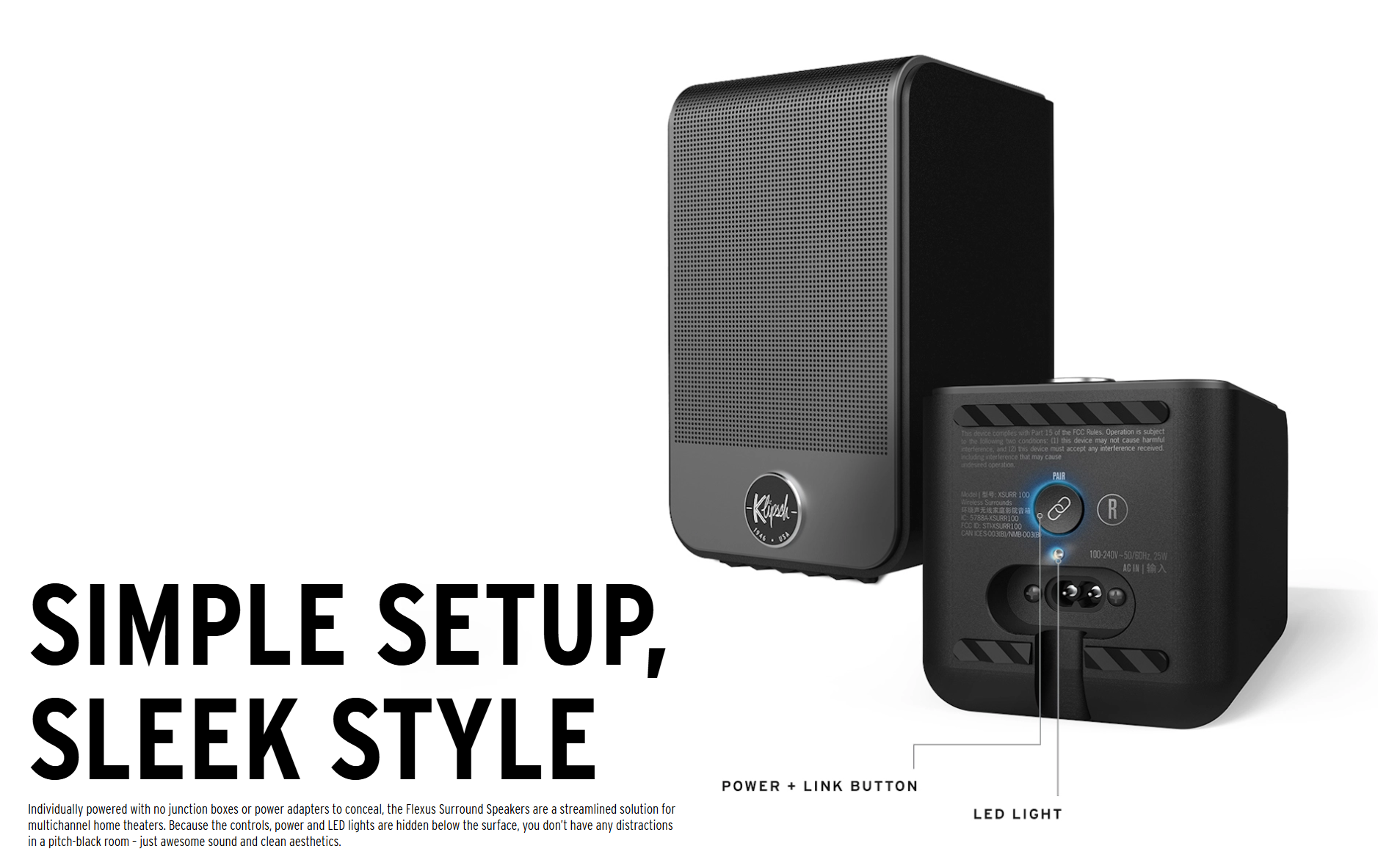 專為 Flexus 系列設計的無線環繞喇叭,提供2.0聲道環繞聲效,搭載3吋紙盆全頻單元和內置25瓦放大器,