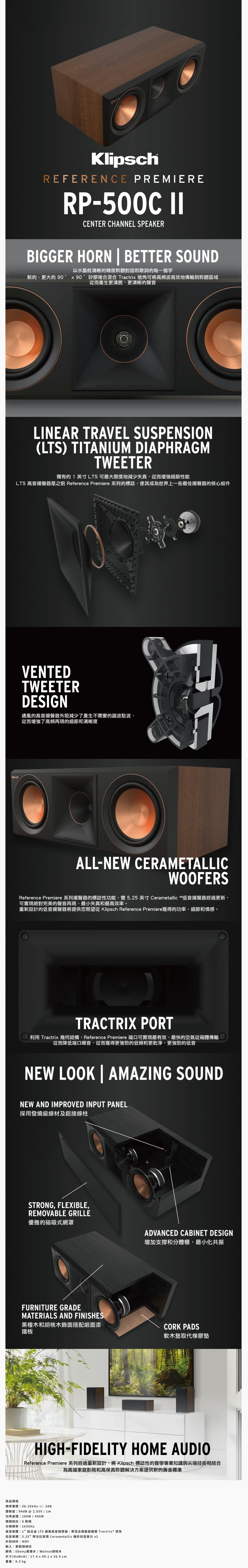 Klipsch RP-500C II 中置喇叭 Reference Premiere 系列 RP500C II 揚聲器的標誌性功能,