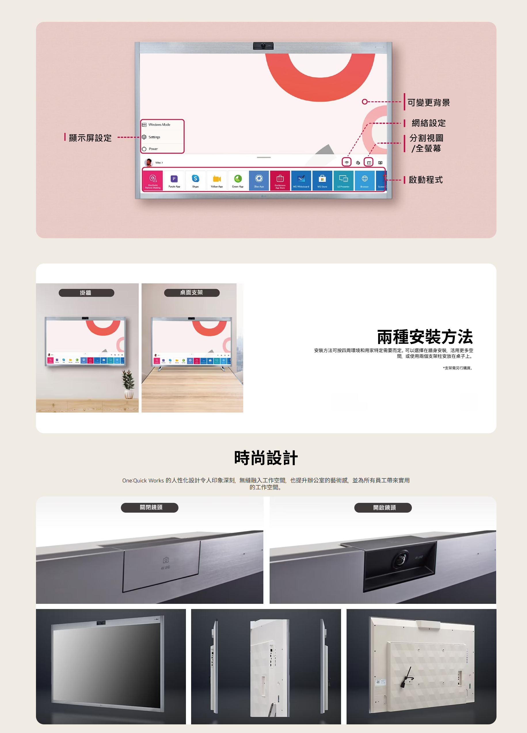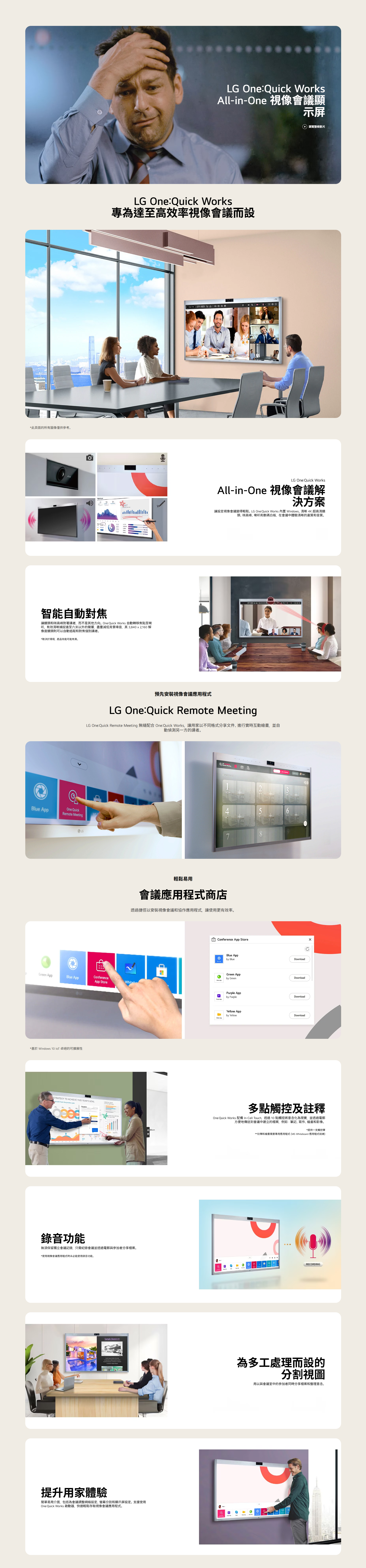它內置 LG One:Quick Remote Meeting 軟件,方便即時協作、文件分享及遠端會議,適合企業、教育及協作空間。
