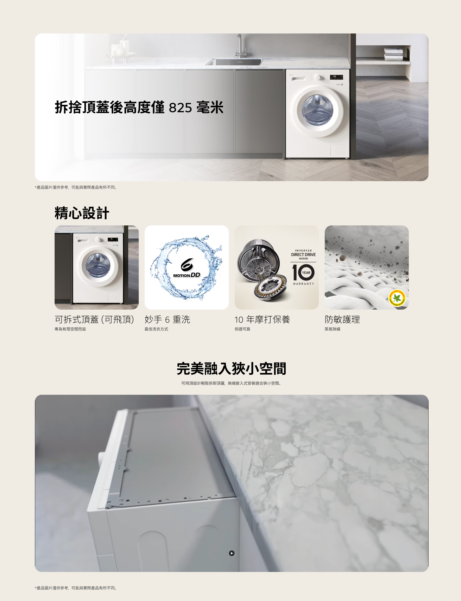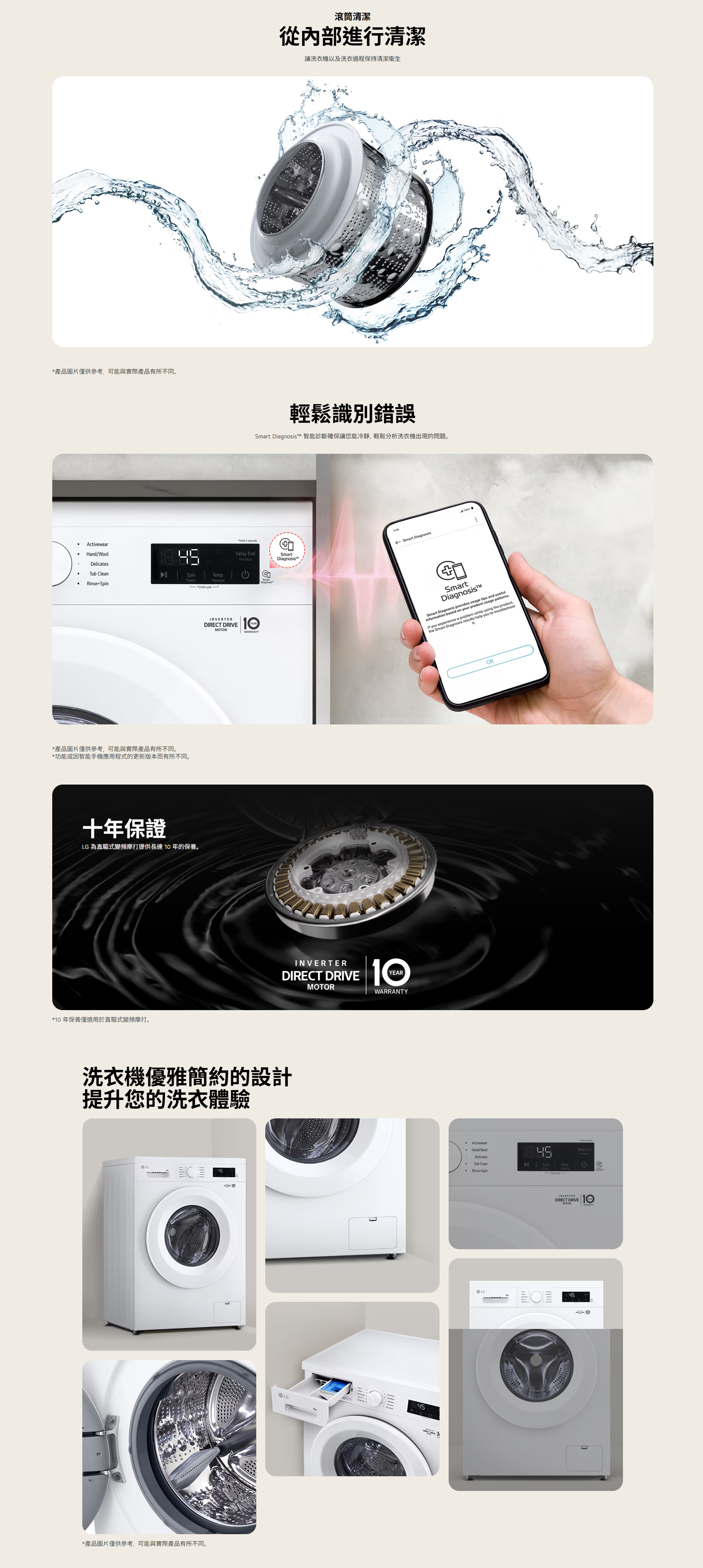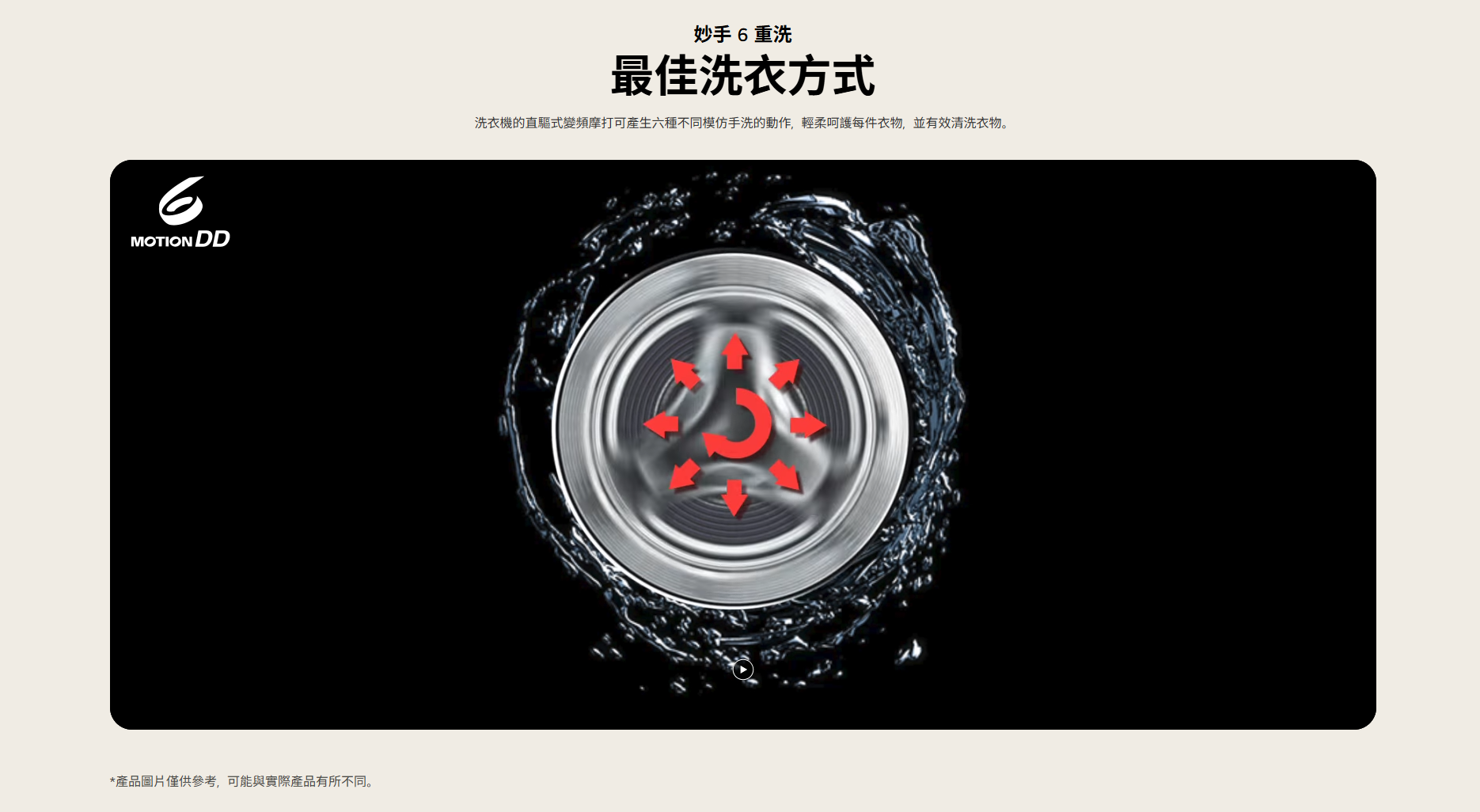 採用LG直驅式變頻摩打,運行更寧靜、耐用。專利 6 Motion Direct Drive「妙手6重洗」模仿真人手洗,