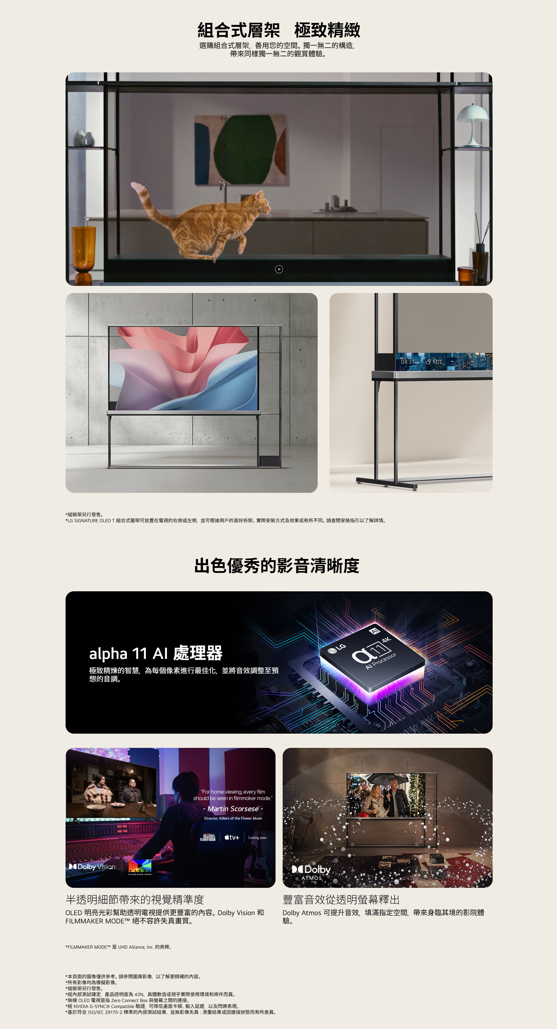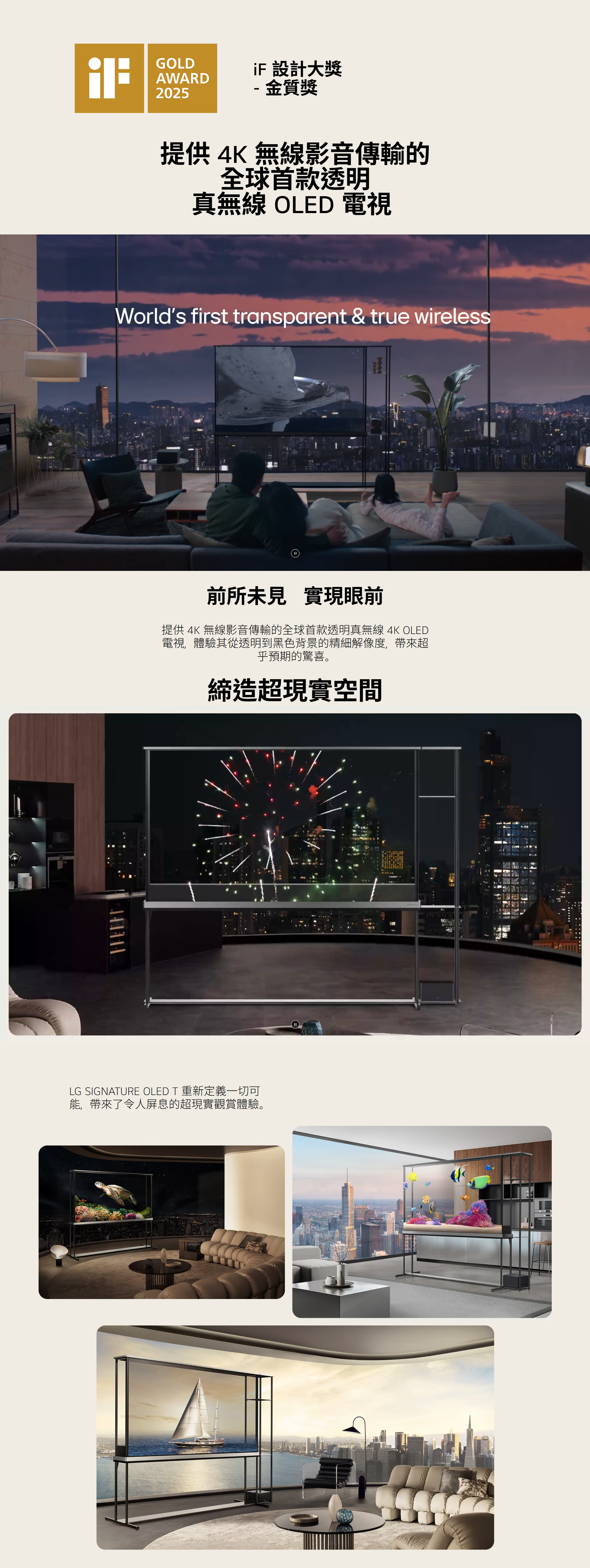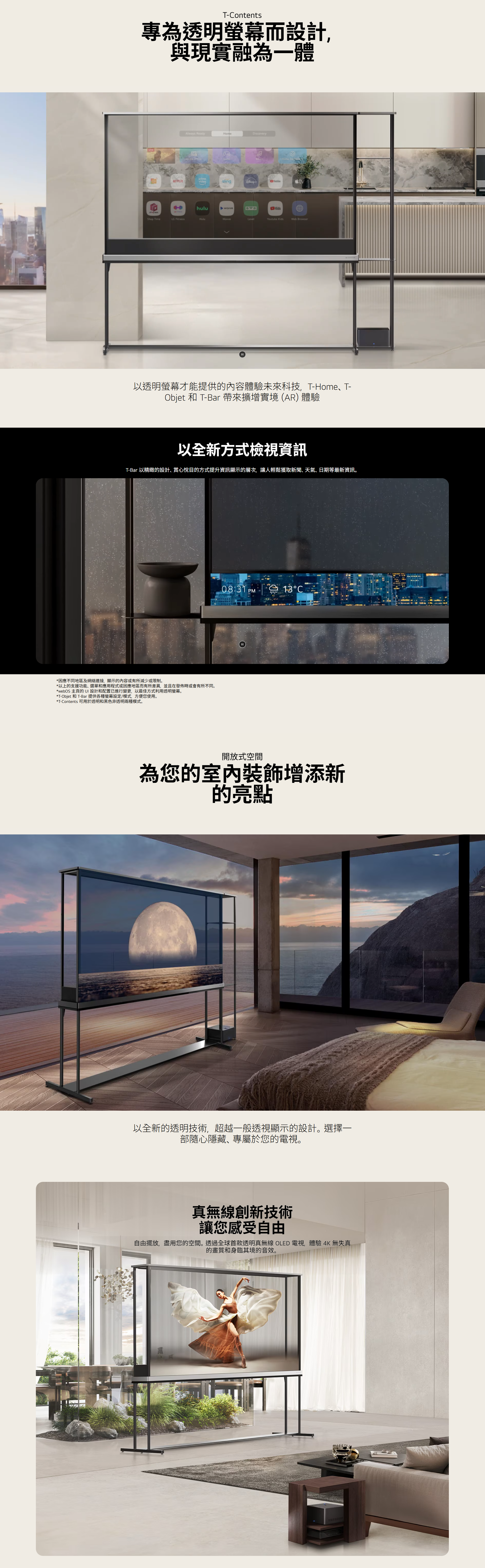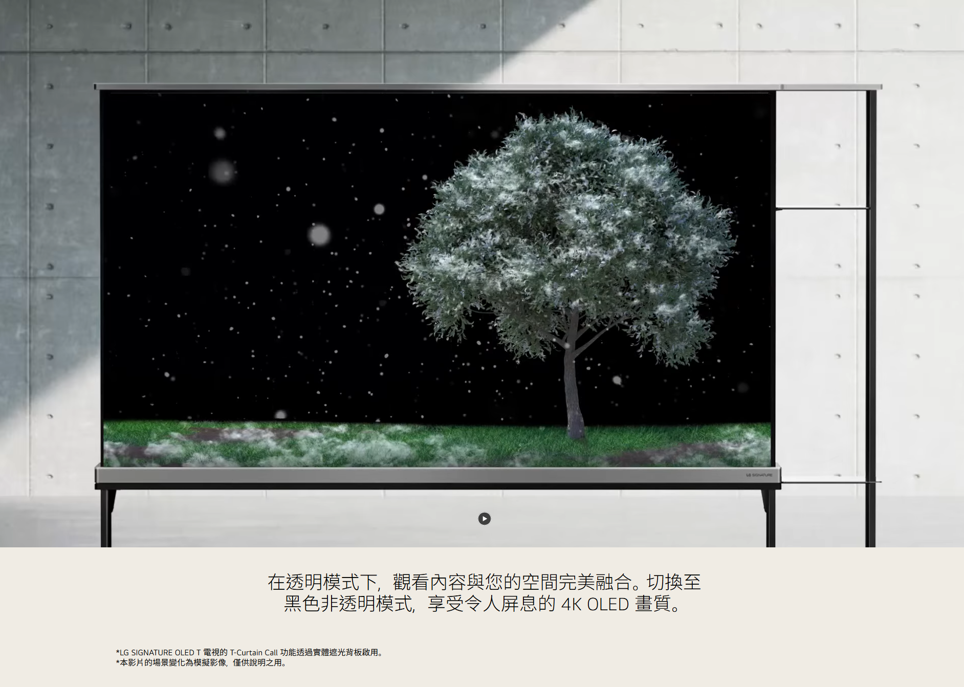 LG OLED77T4PCA 77吋 4K透明OLED 突破了現有電視技術框架,是全球首款透明和真正無線的 4K OLED 電視。 LG 77T4 能夠在透明和非透明模式之間無縫切換,