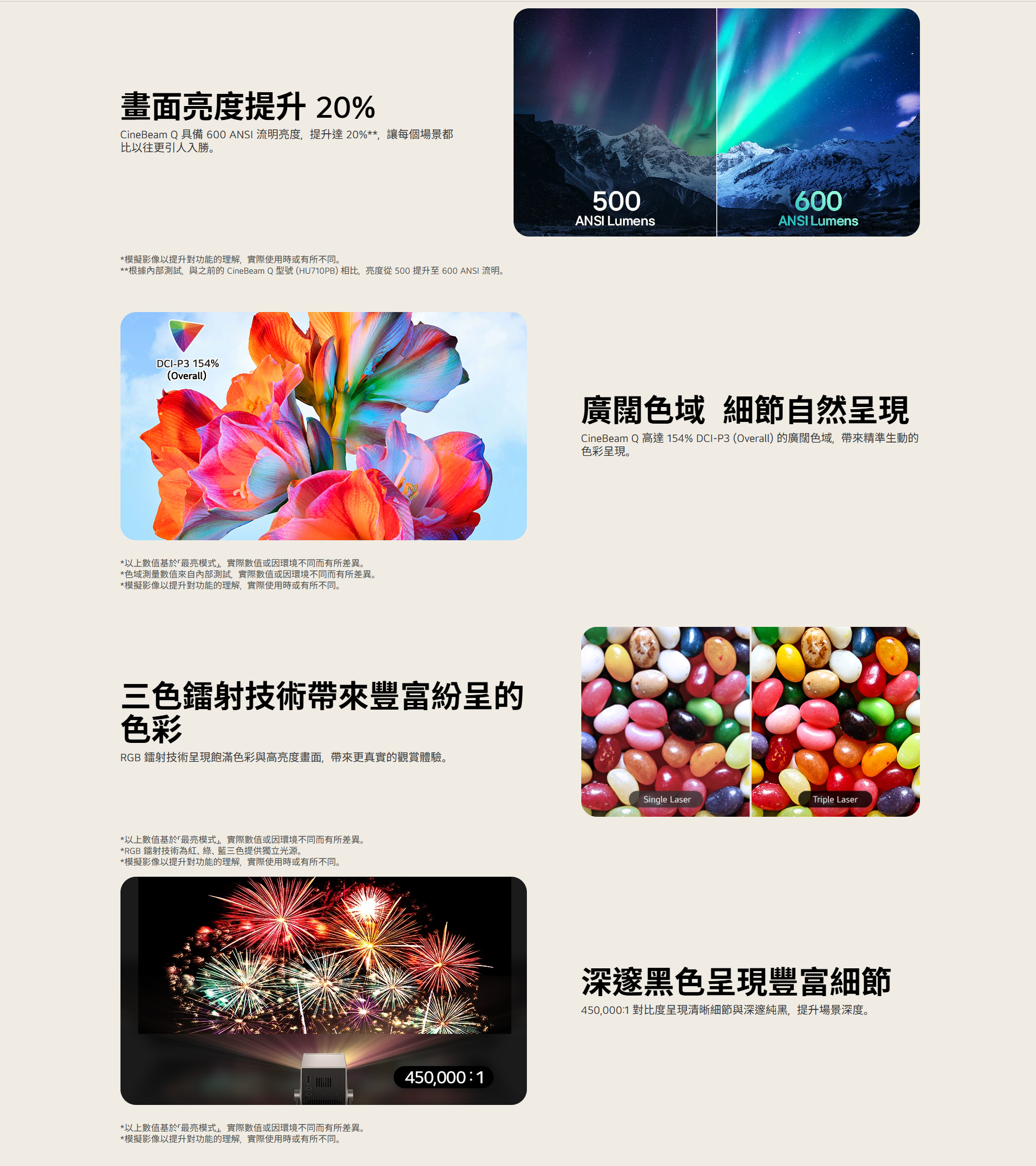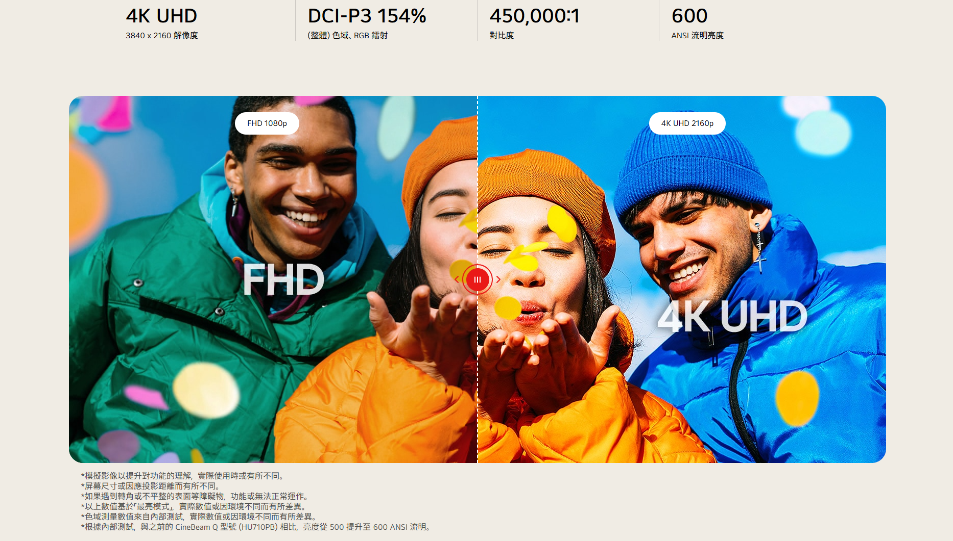 4K UHD 超高清畫質:搭載 RGB 三色雷射技術,色彩還原度極高。