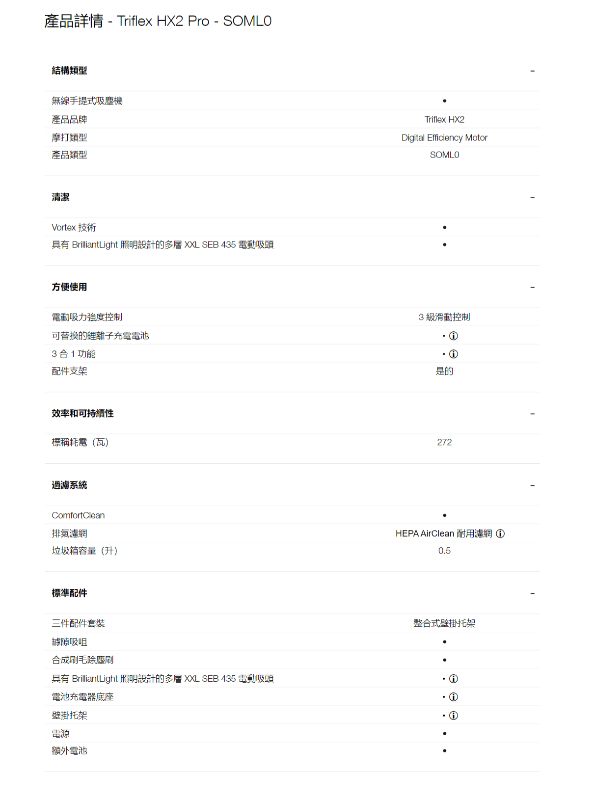 隨機配件:牆壁掛架/傢俬吸嘴/縫隙吸嘴/除塵刷/配件掛勾/額外電池/充電座/硬地板刷