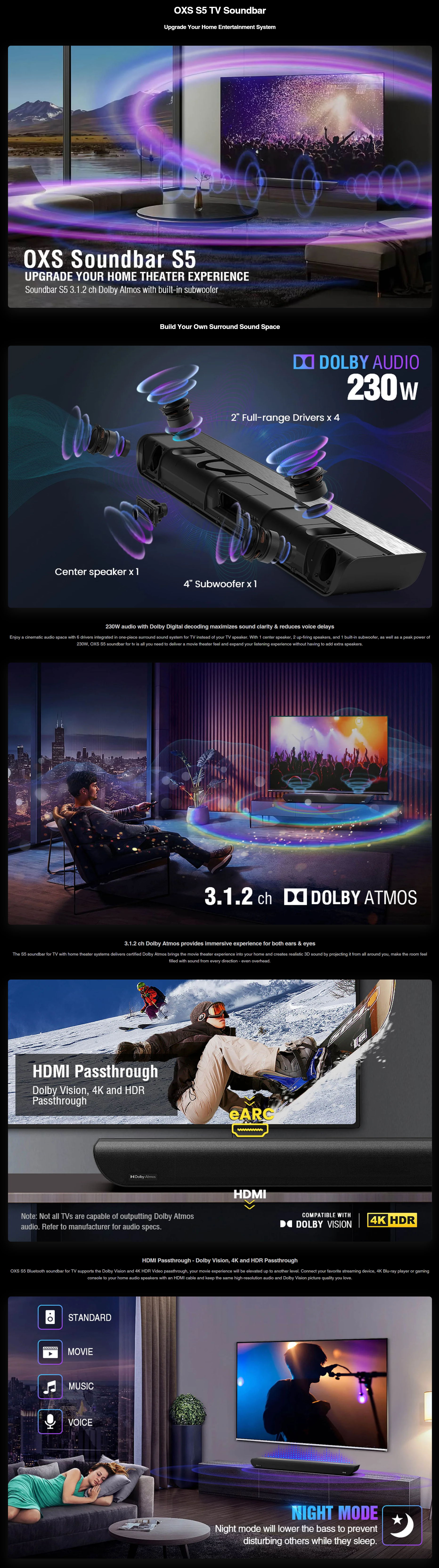 OXS S5 3.1.2 聲道 Dolby Atmos Soundbar 是專為提升家庭娛樂體驗而設計的高端音響設備。