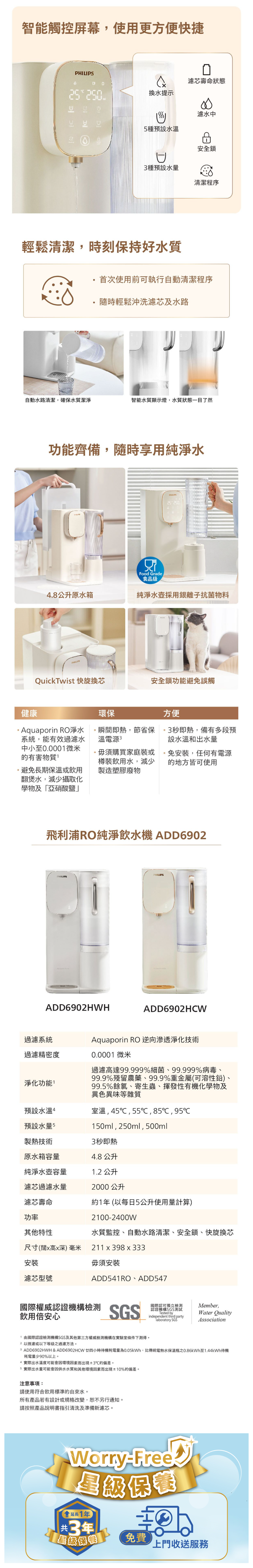 PHILIPS 飛利浦 ADD6902 RO純淨飲水機(米白色) ADD6902HCW01,⭐全新香港行貨 , 原廠兩年保養🚚免費送貨(偏遠地區除外)⭐檯面式設計 尺寸W211 x H398 x D333mm小巧不佔位,4.8L大容量自來水箱+1.3L便攜純淨水壺,適合香港家庭即濾即飲。