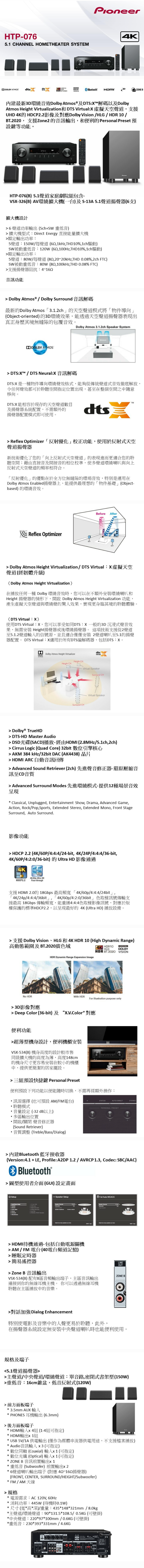 Pioneer HTP-076配備 PIONEER VSX-326 5.1聲道影音擴音機