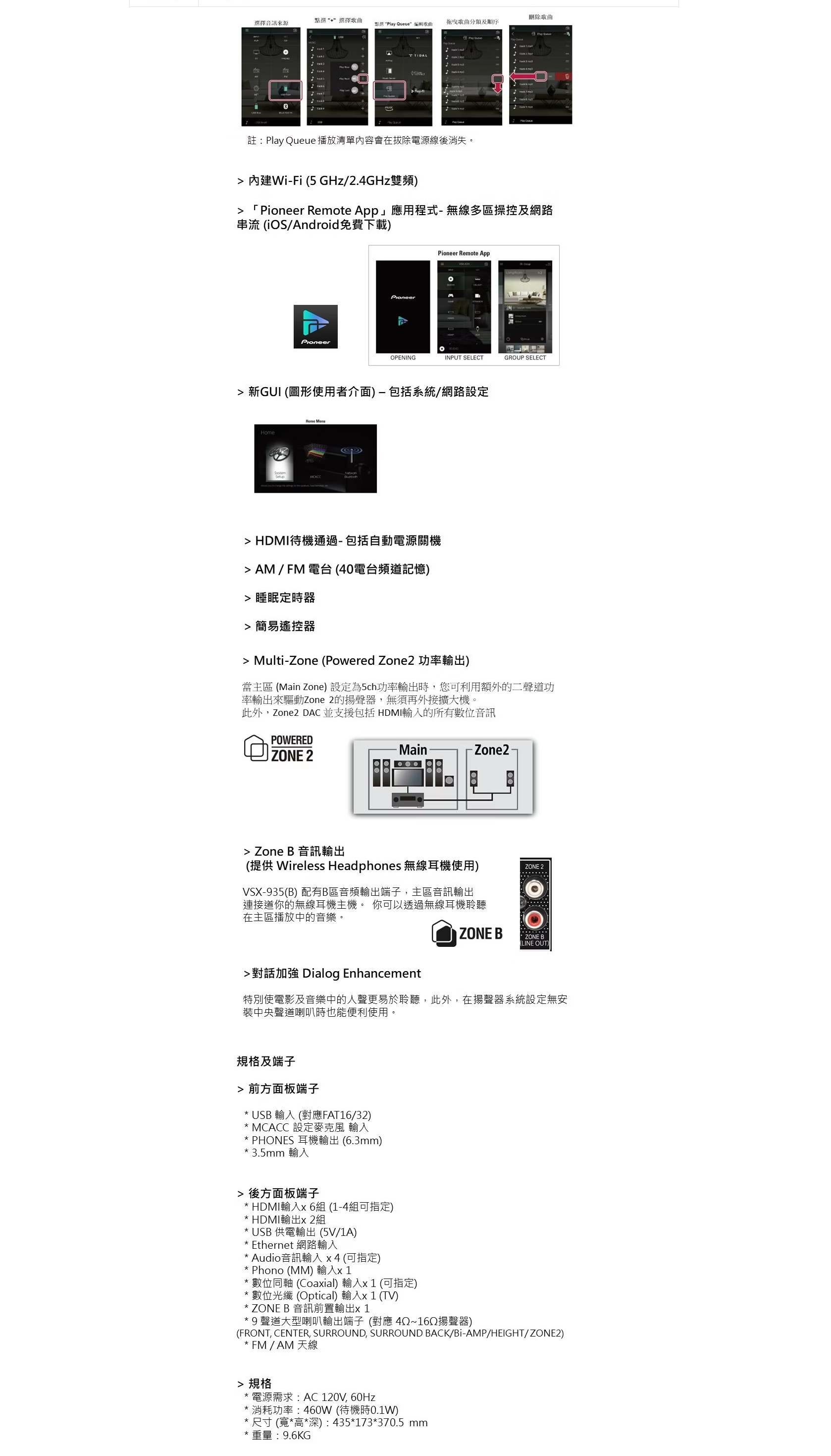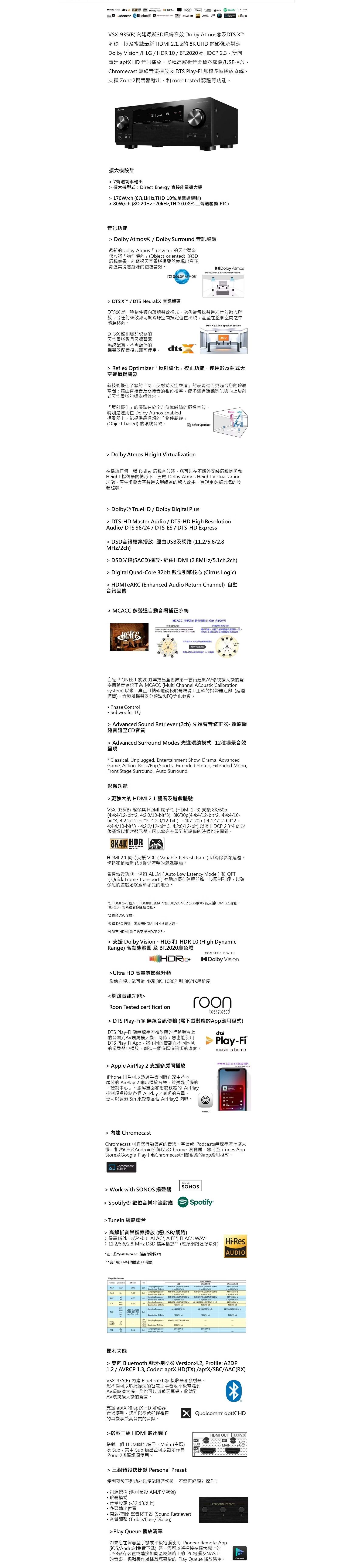 Pioneer VSX-935 擁有全新易於使用的新設計,最新的 Dolby Atmos 及 DTS: X 讓你浸沈在四面包圍的音場之中,即使沒有架設高空或環繞聲喇叭,你仍然可以享受到具上空音場的虛擬3D環繞聲效果。因為有 Dolby Atmos Height Virtualizer 及 DTS Virtual:X 虛擬技術,VSX935 亦對應超高清影像,HDR10、HGL、Dolby Vision 等,你可以慢慢欣賞精細的 4K 節目。