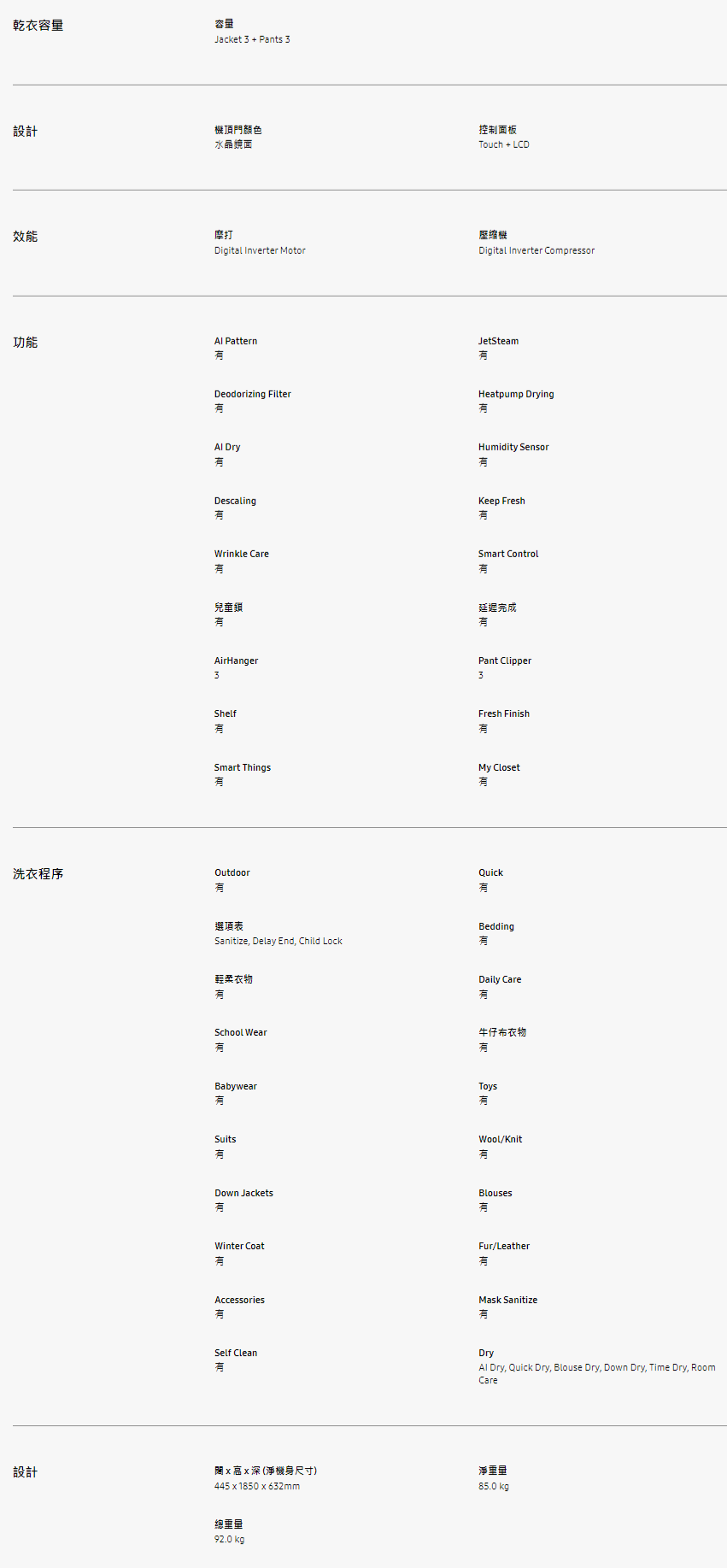 闊 x 高 x 深 (淨機身尺寸) : 445 x 1850 x 632mm