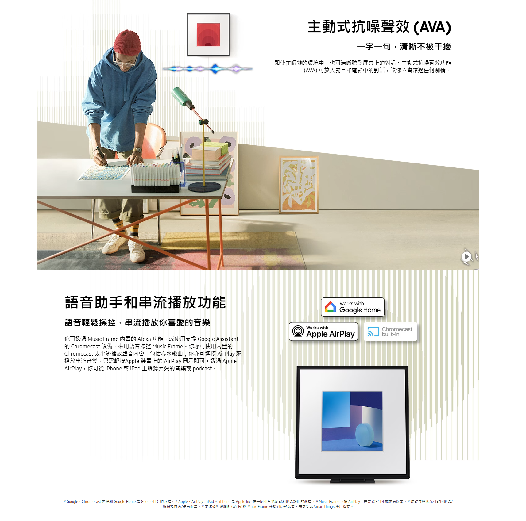 內置 6 組喇叭,帶來沉浸式環繞體驗。可自訂面板、插入相片或藝術作品,無線支援 Wi-Fi、藍牙及 AirPlay,