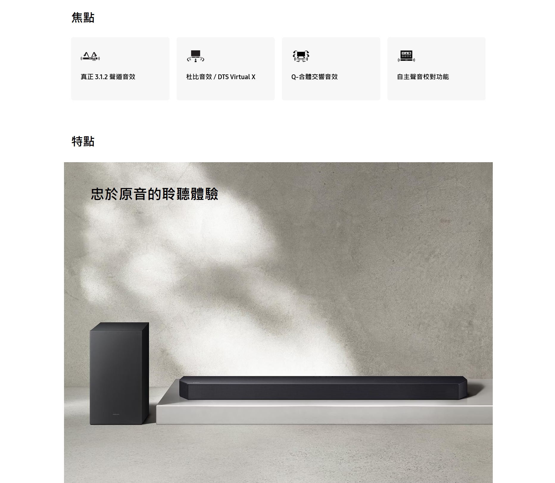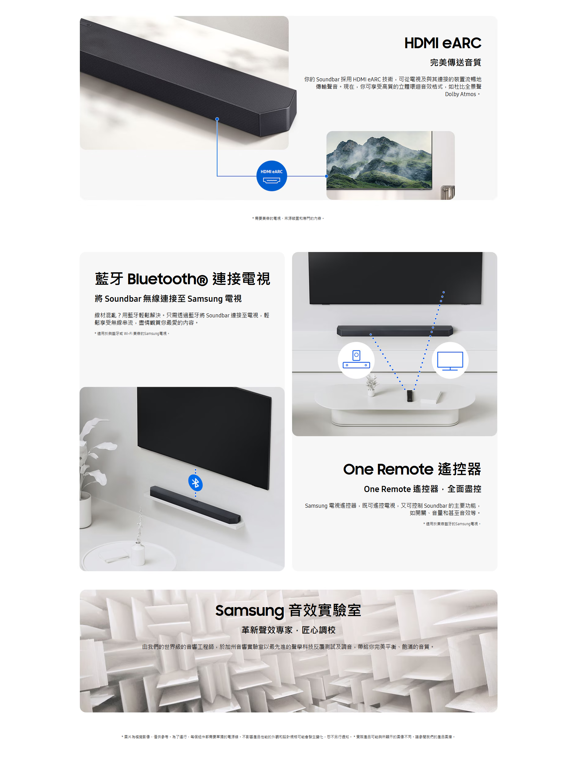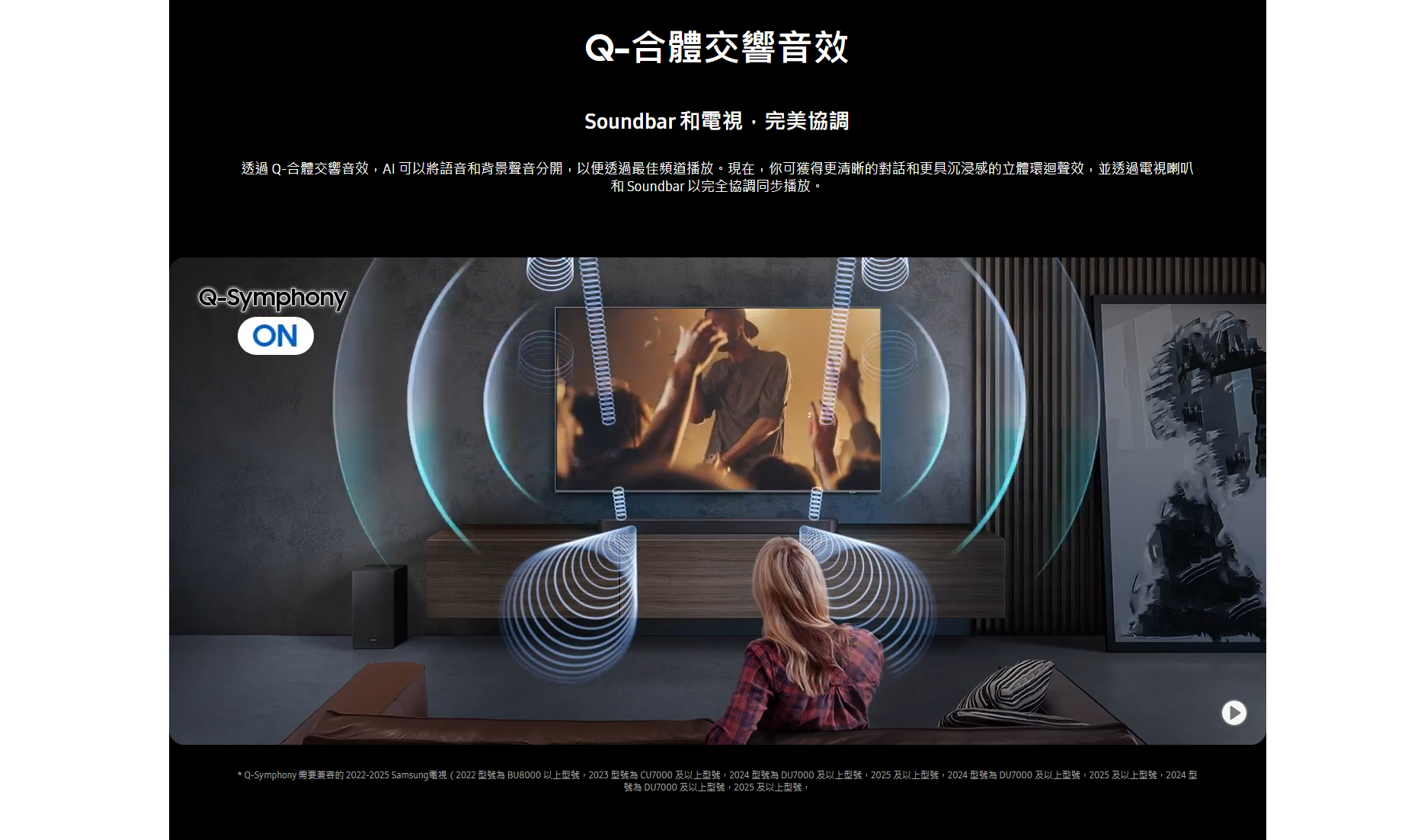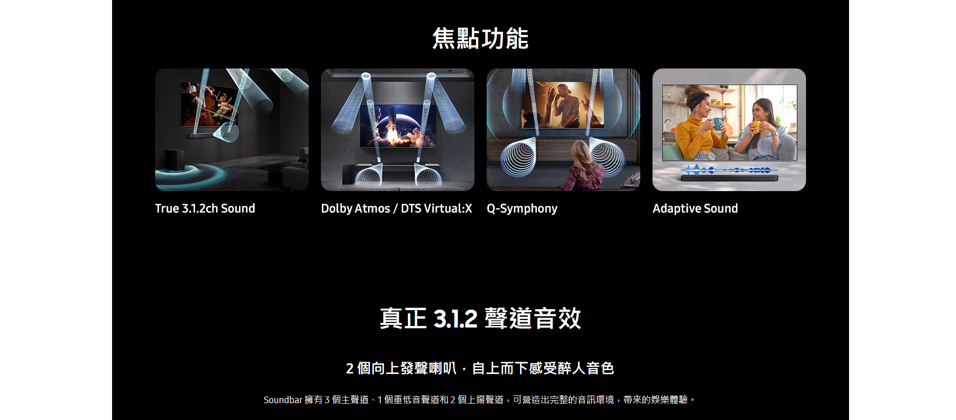 三星 Q-series Soundbar 擁有強勁音效及多功能特色,適合追求高品質家庭影院的人士。其最大優點包括支援 Dolby Atmos 及 DTS Virtual:X 技術,提供震撼 3D 立體聲環繞體驗,兩個 up-firing 喇叭可實現真實的天花聲道效果。Q-Symphony 配合三星電視能智能分配聲音,強化臨場感與清晰度,Adaptive Sound 則根據內容自動優化音效,保持對白清晰,即使低音量也能聽清。