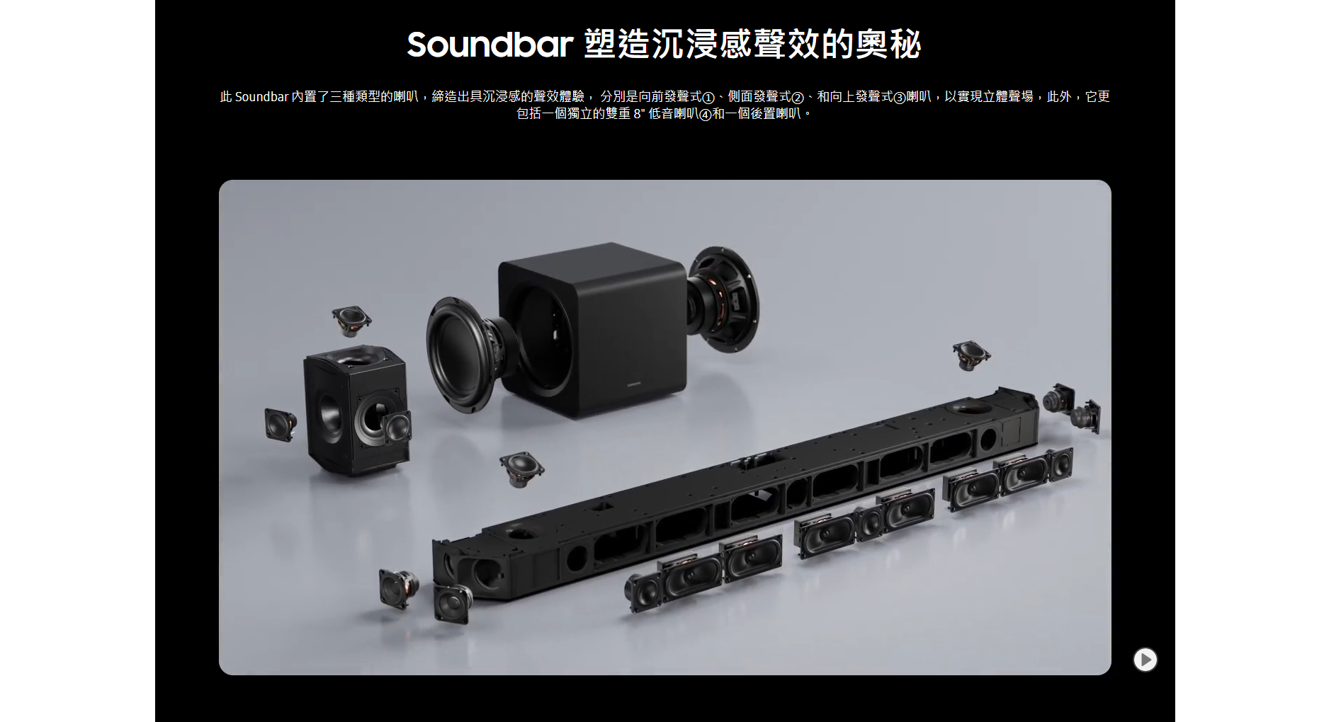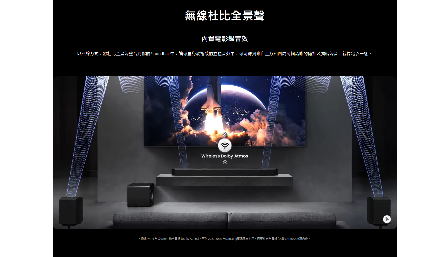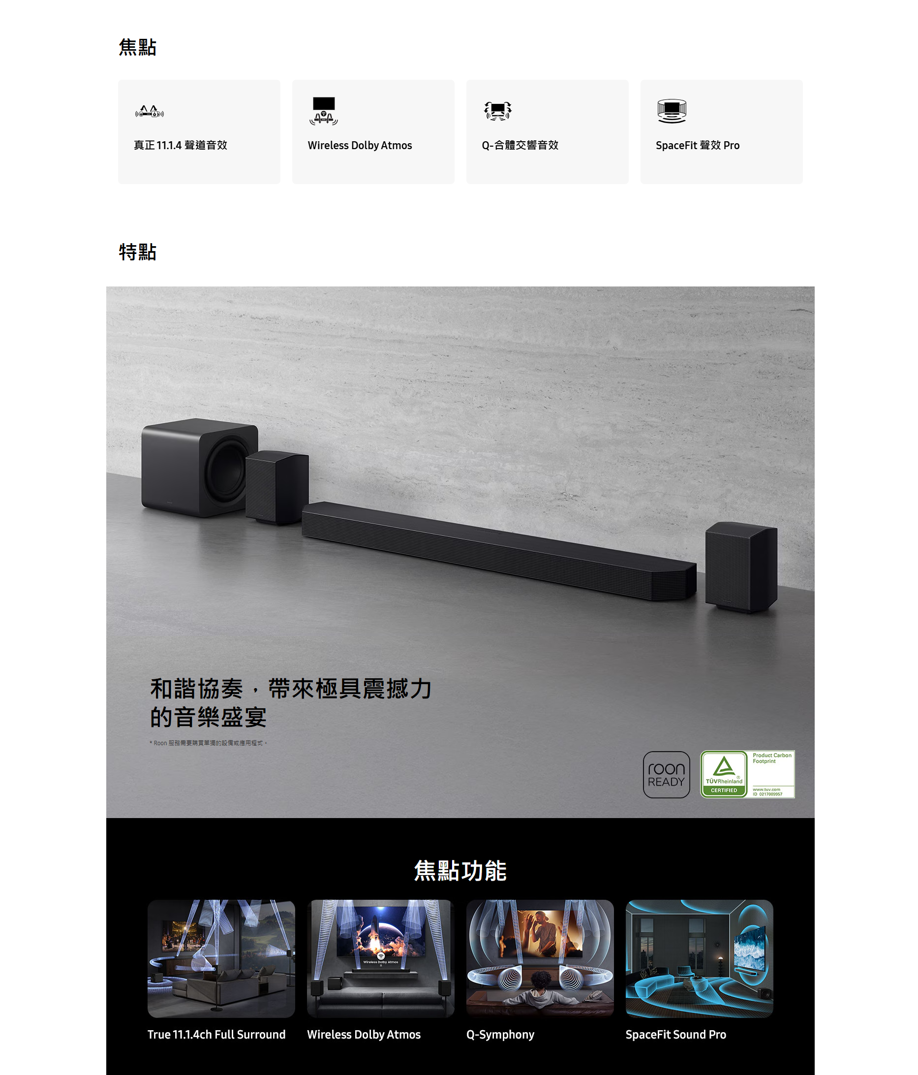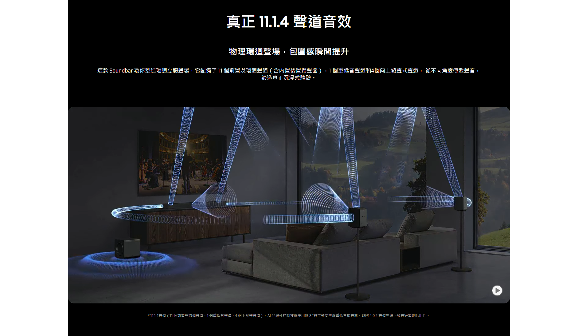 全新旗艦 HW-Q990F Dolby Atmos Soundbar 陣容,其中頂級配置是 11.1.4 聲道 HWQ990F Soundbar 組合,以一支援 Soundbar、一個無線低音喇叭及一對無線環繞聲喇叭組成。