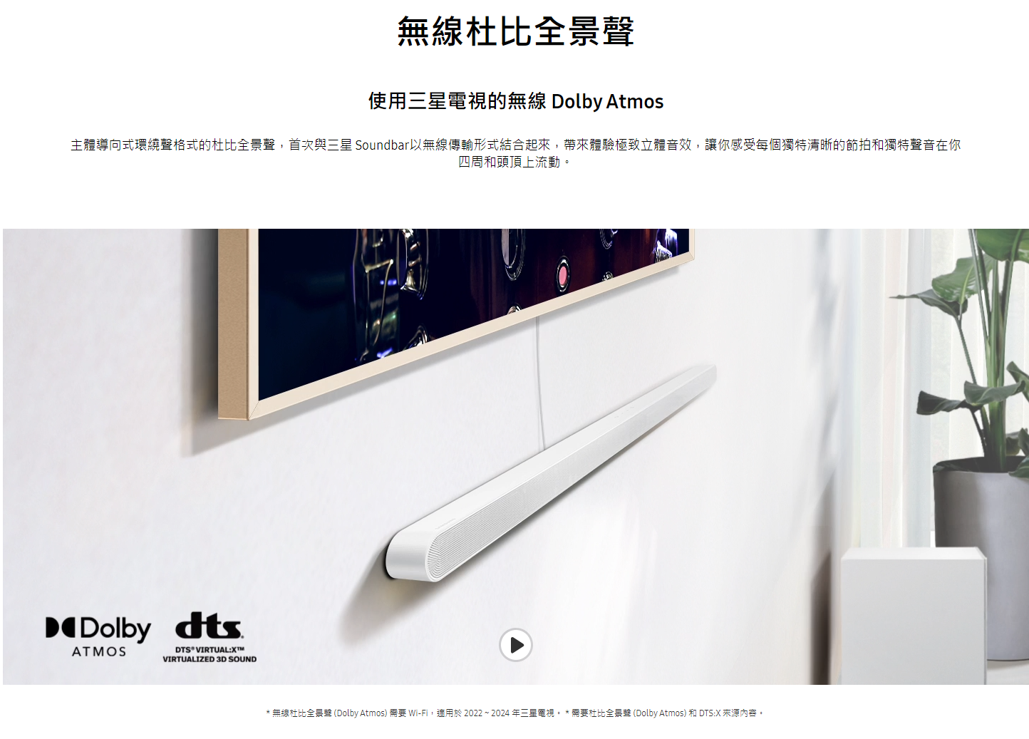 HWS700D 支持 三星電視的無線 Dolby Atmos Dolby Audio 和 DTS Virtual:X 技術,