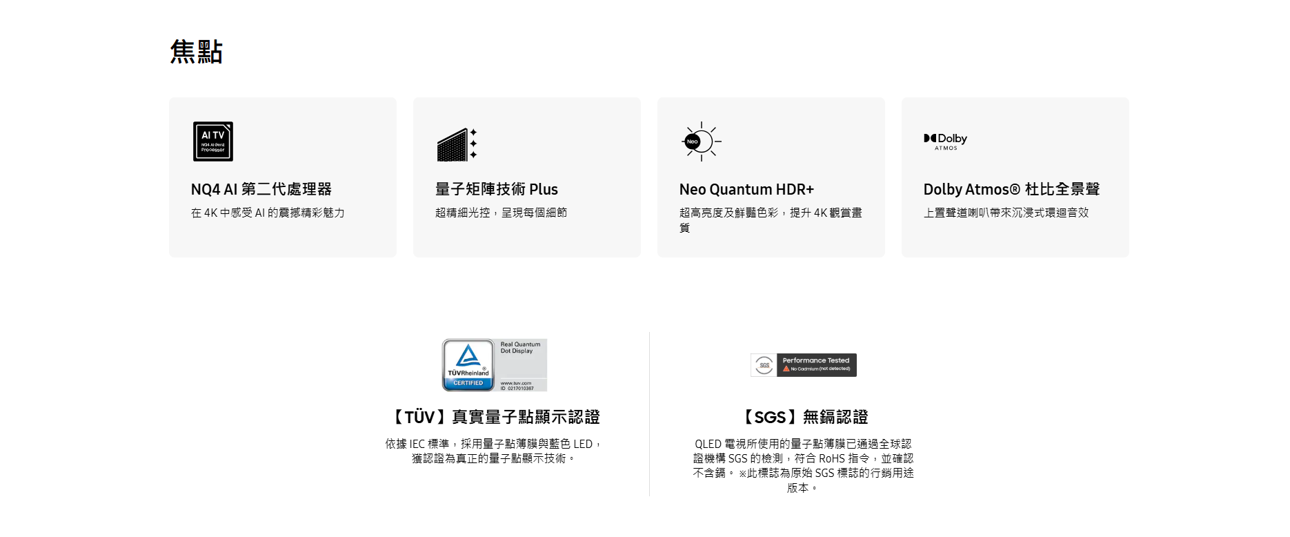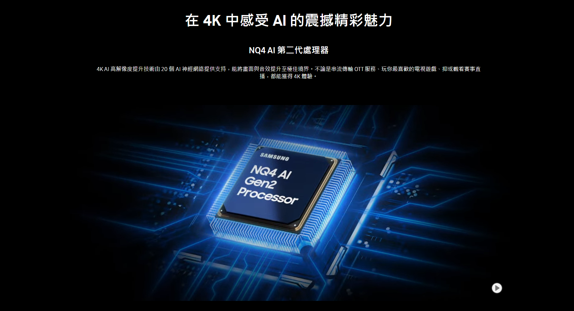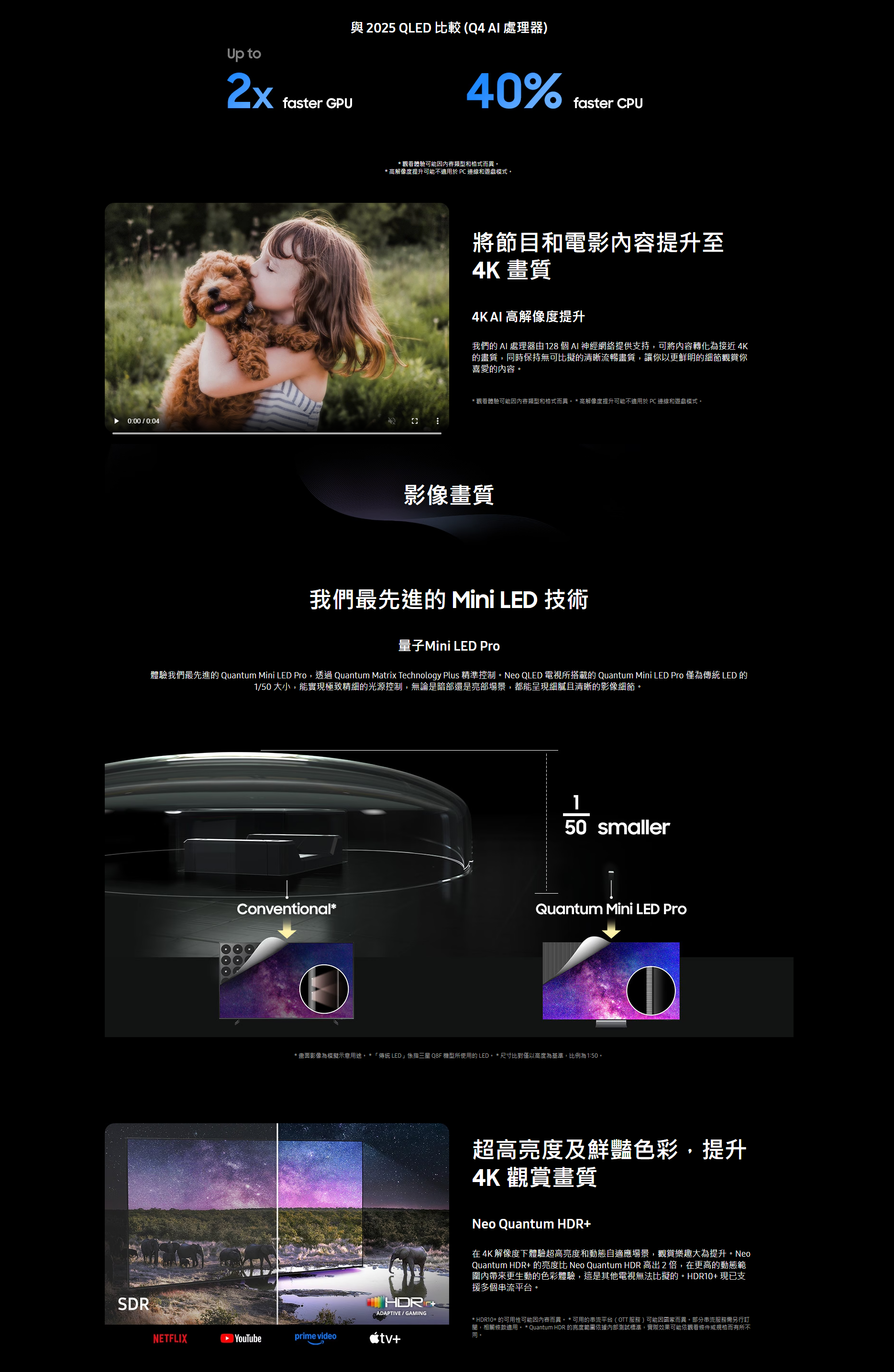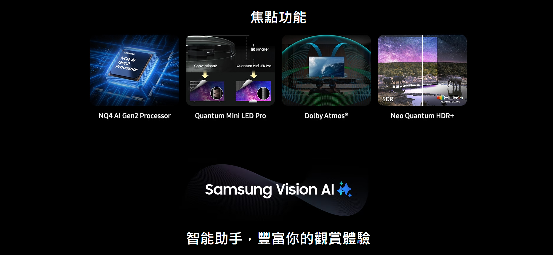 與第二代NQ4 AI處理器,帶來極致細緻影像。量子點 Mini LED技術實現超精細光控,呈現更深黑位與非凡亮度,