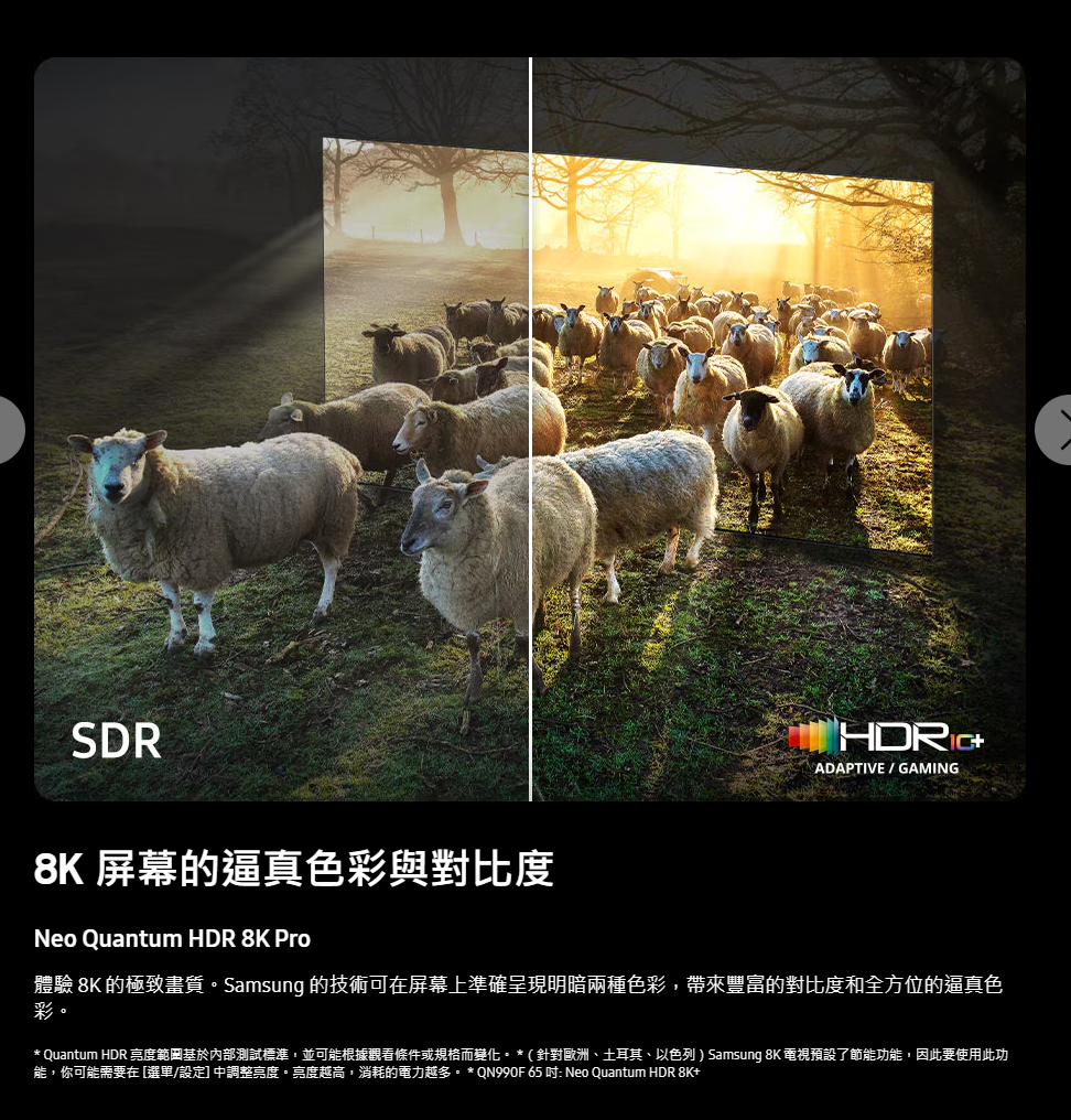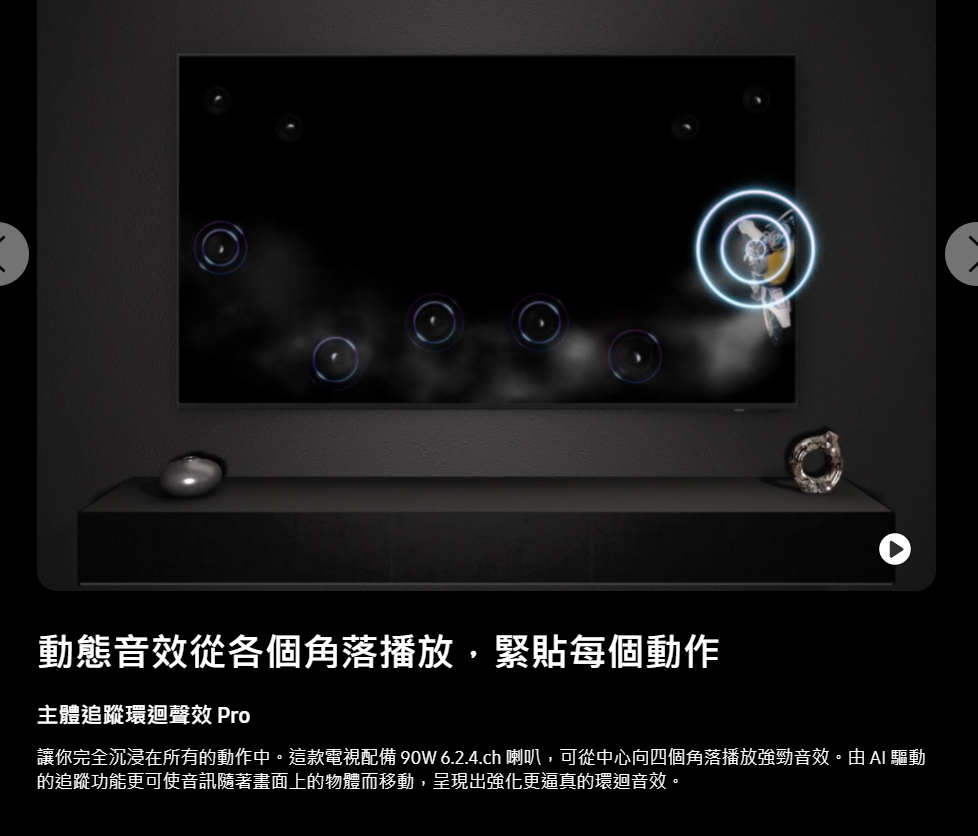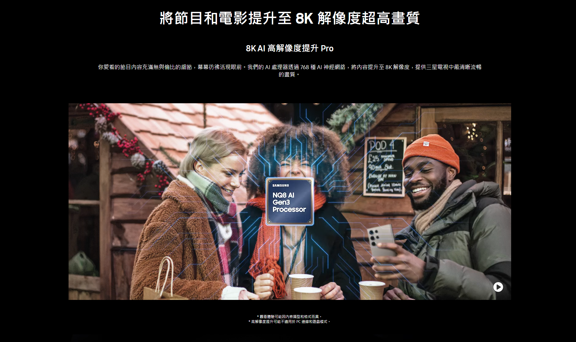 三星 AI 處理器透過 768 種 AI 神經網絡,將內容提升至 8K 解像度,提供三星電視中最清晰流暢的畫質。