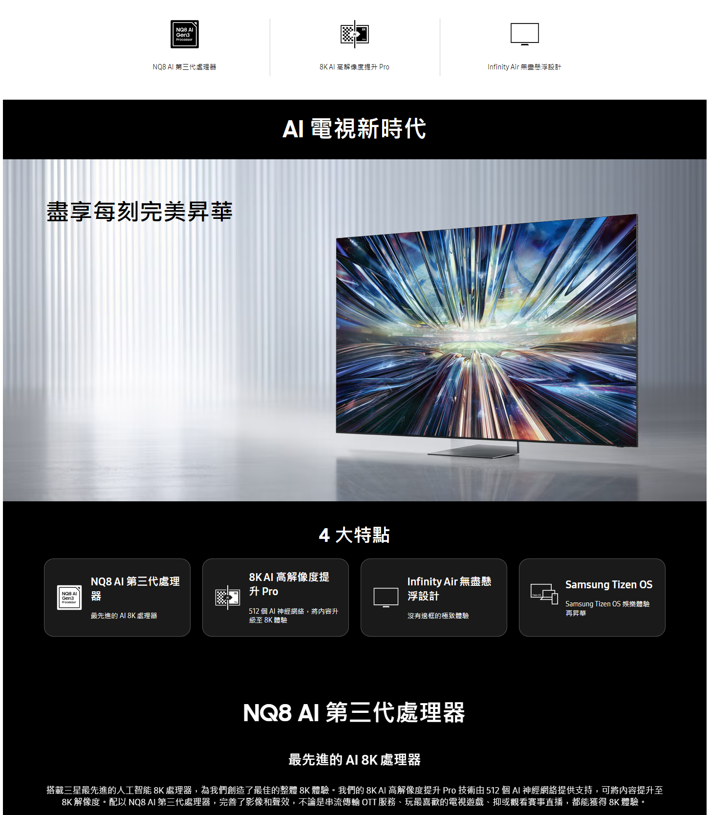 NQ8 AI 第三代處理器是最先進的人工智能 8K 處理器,為我們創造了最佳的整體 8K 體驗。