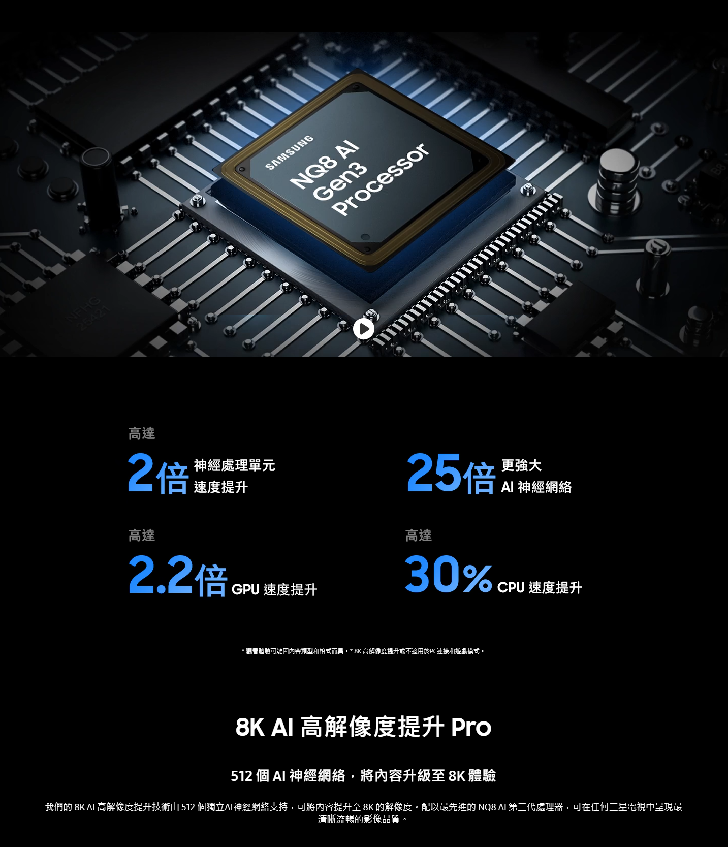 三星的 8K AI 高解像度提升 Pro 技術由 512 個 AI 神經網絡提供支持,可將內容提升至 8K 解像度。