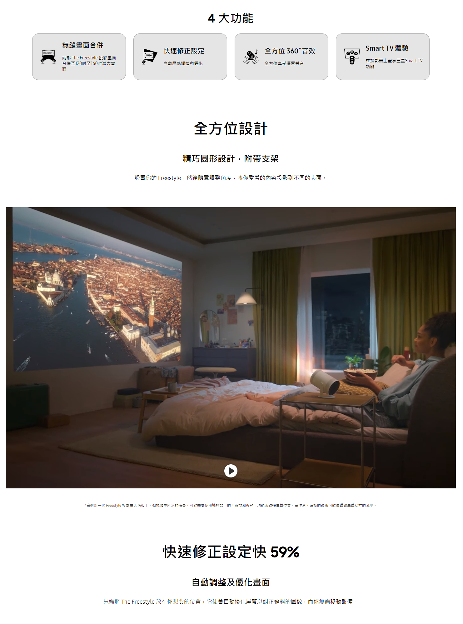 快速設定及自動畫面修正快59% (對焦、梯形修正、水平調)