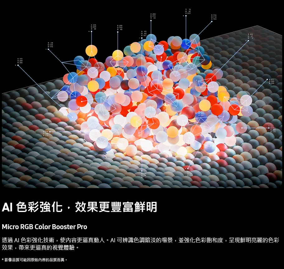 最大優點在於結合微米級紅、綠、藍 RGB LED 背光(每粒尺寸小於100微米),每顆RGB可獨立精確控制,色彩層次分明、