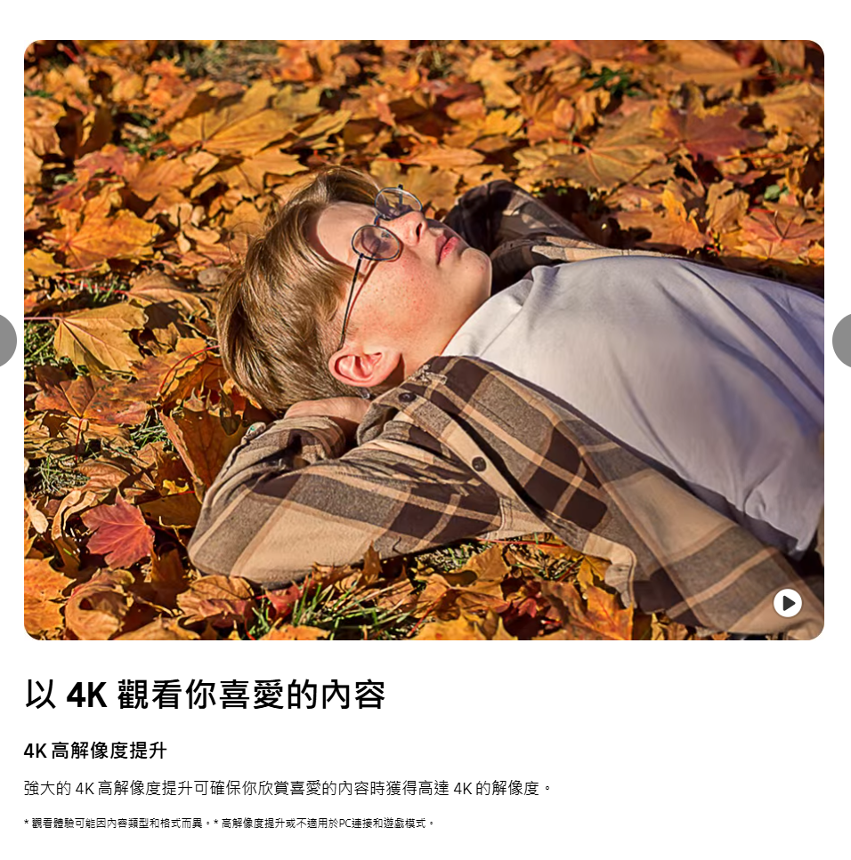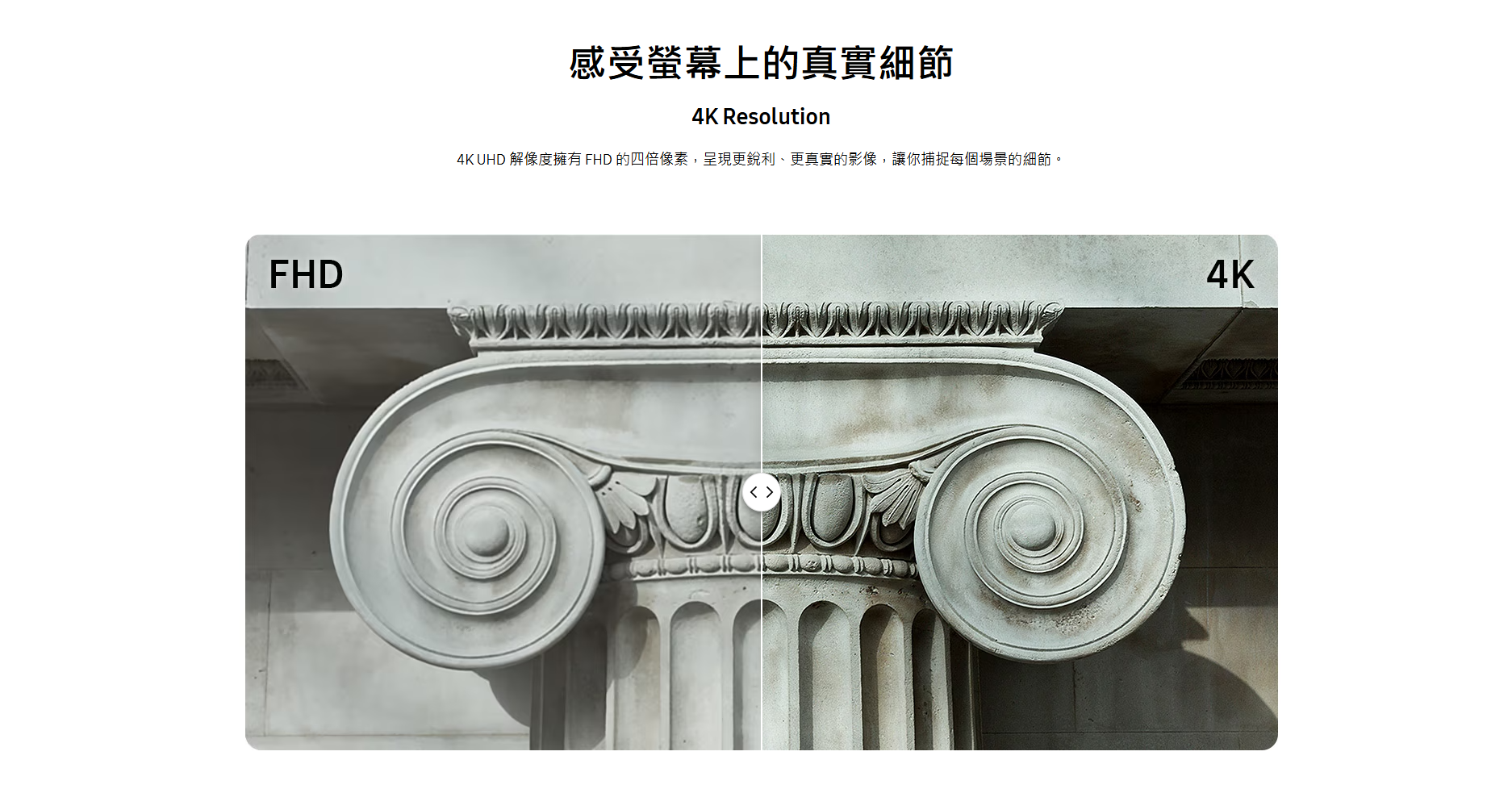 4K UHD 解像度擁有 FHD 的四倍像素,呈現更銳利、更真實的影像,讓你捕捉每個場景的細節。