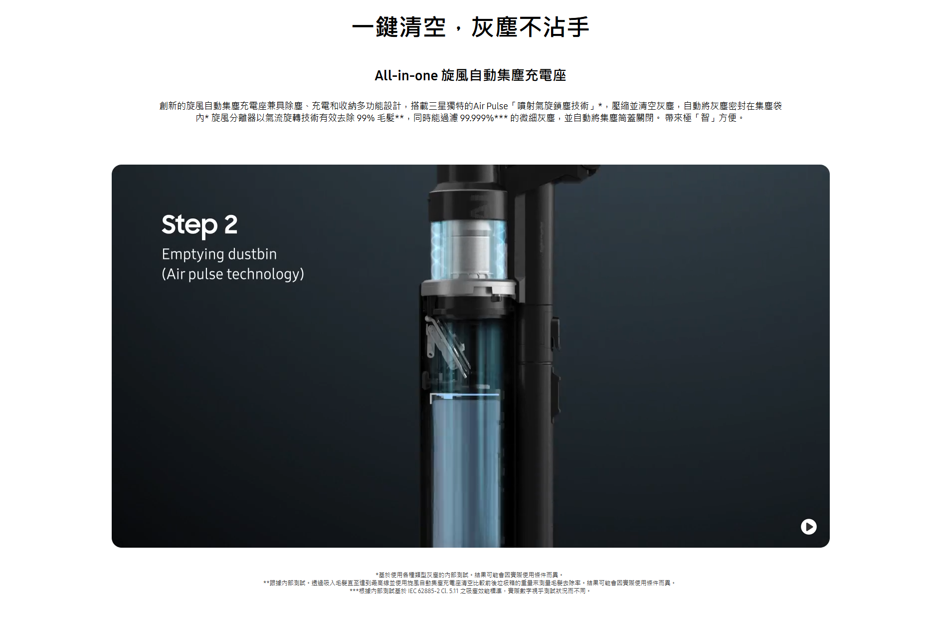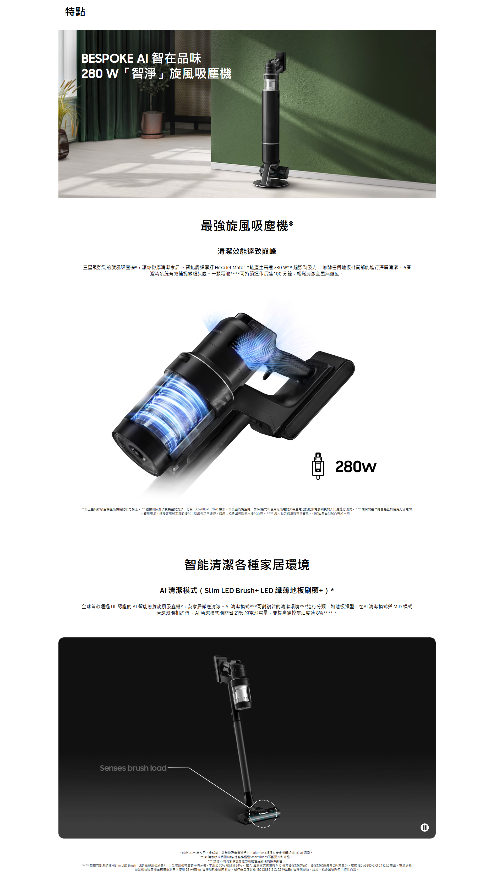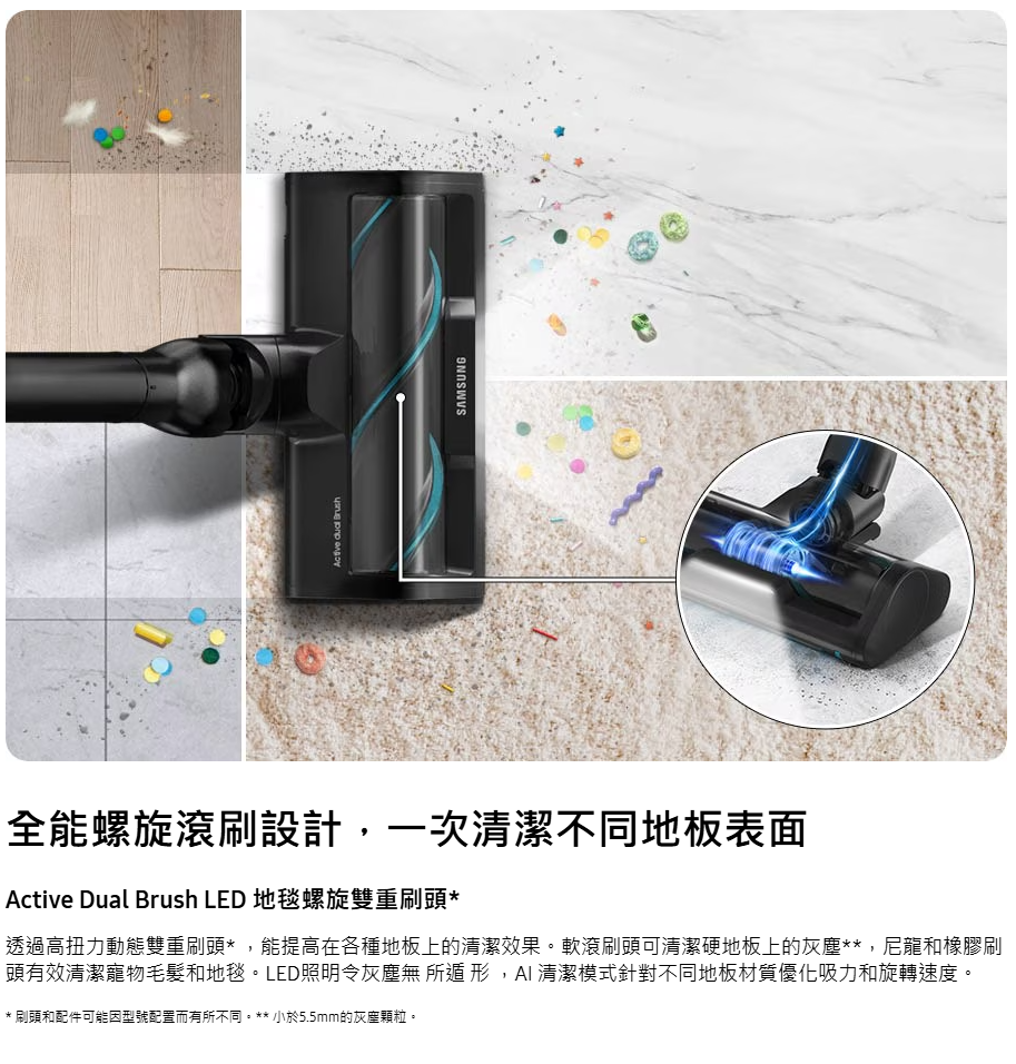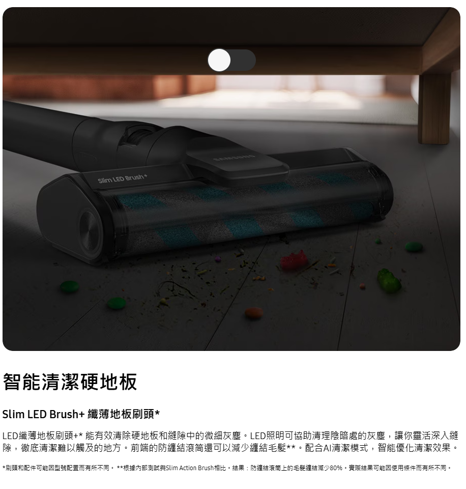 智能清潔各種家居環境 AI 清潔模式(Slim LED Brush+ LED 纖薄地板刷頭+)自動除塵、充電、收納 三合一 : All-in-one 旋風自動集塵充電座。