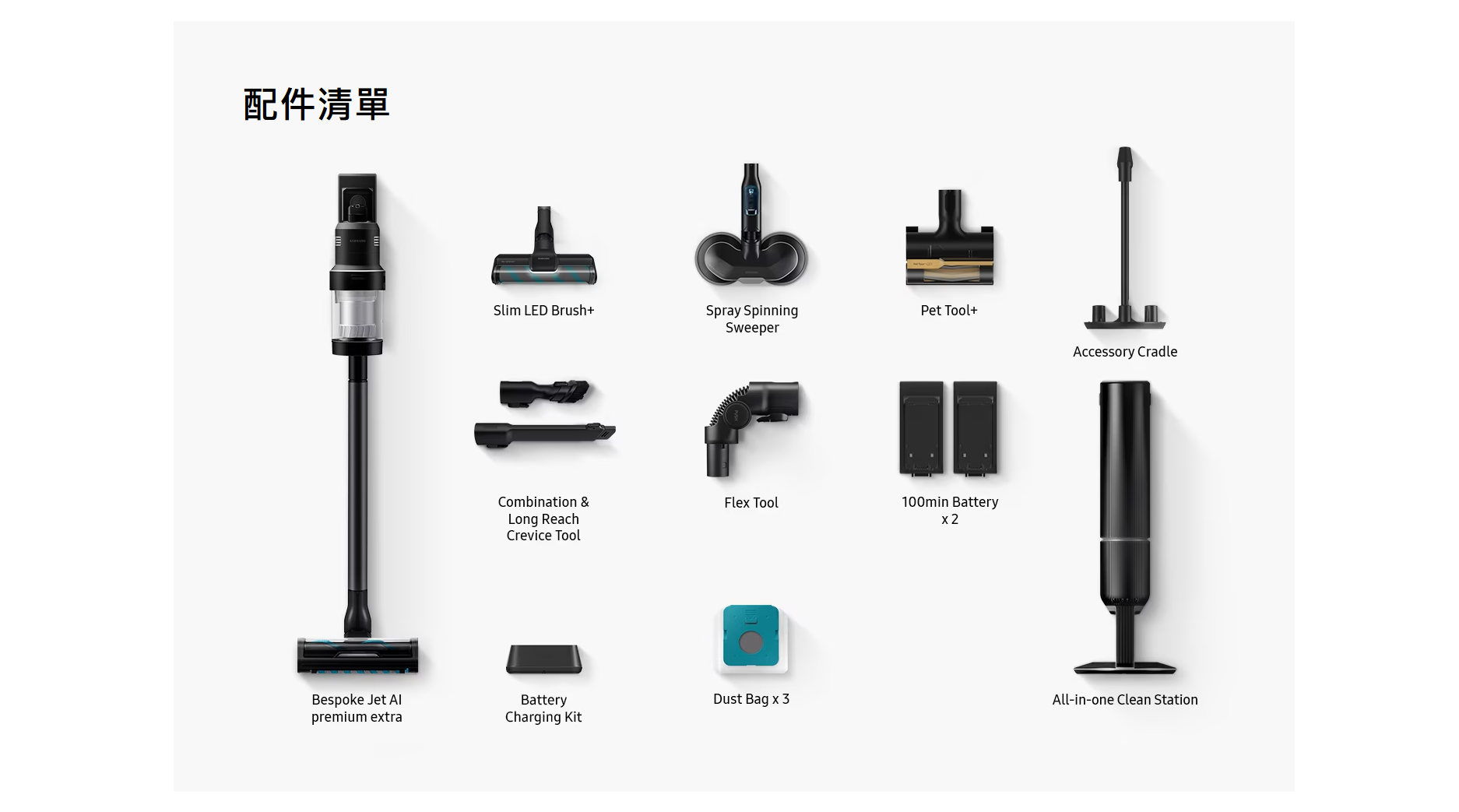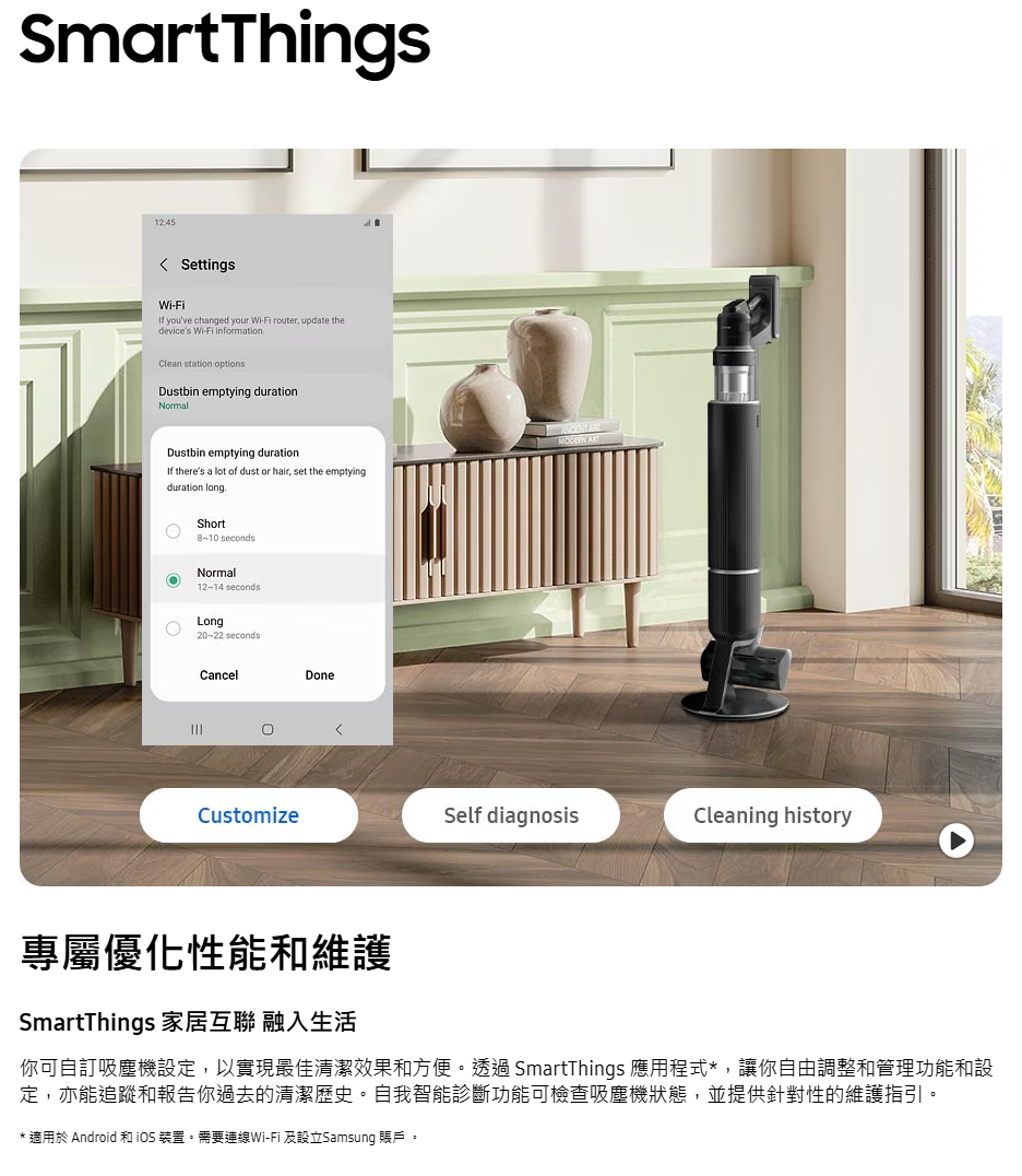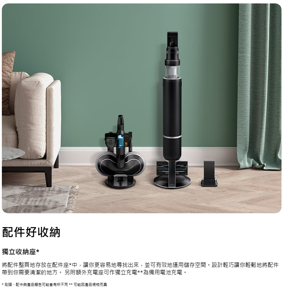智能清潔各種家居環境 AI 清潔模式(Slim LED Brush+ LED 纖薄地板刷頭+)自動除塵、充電、收納 三合一 : All-in-one 旋風自動集塵充電座。