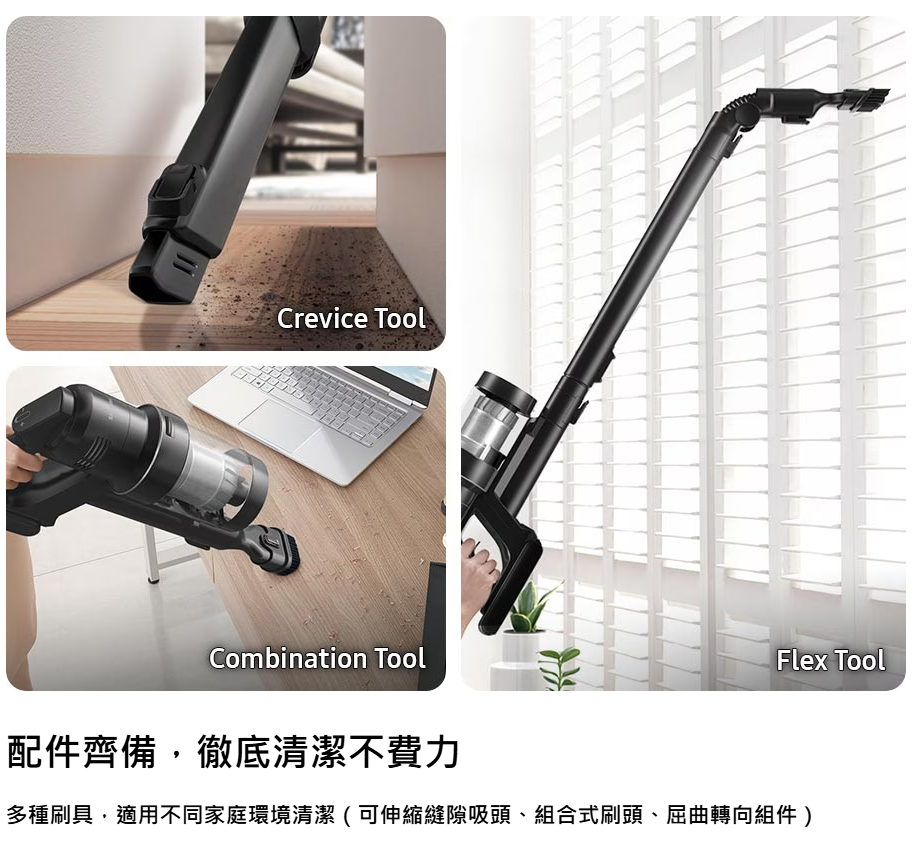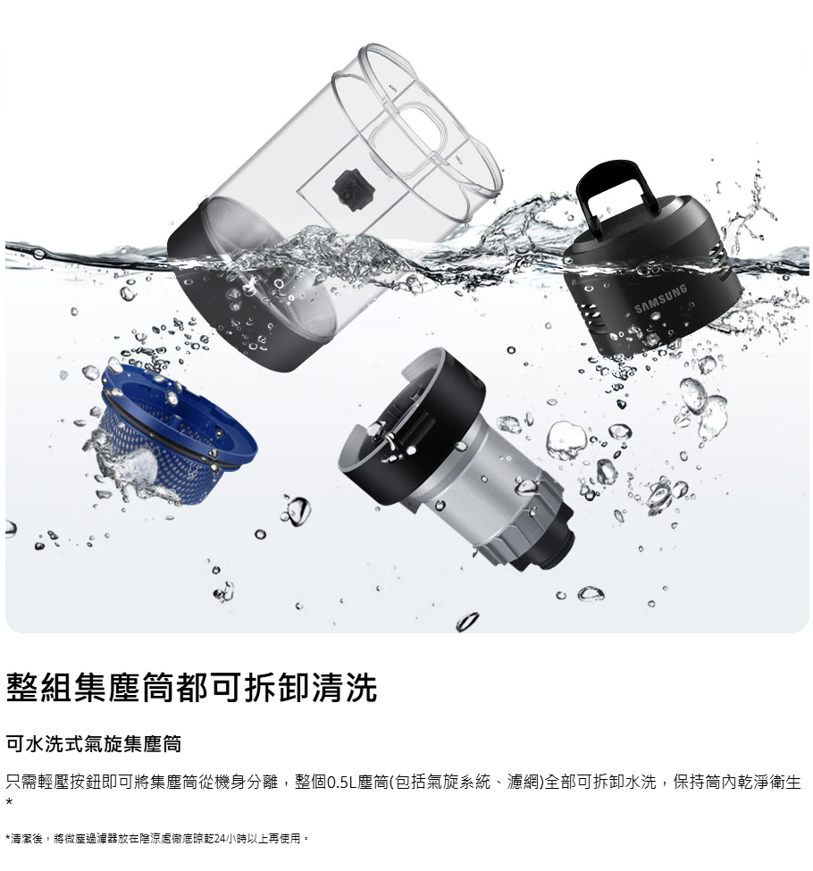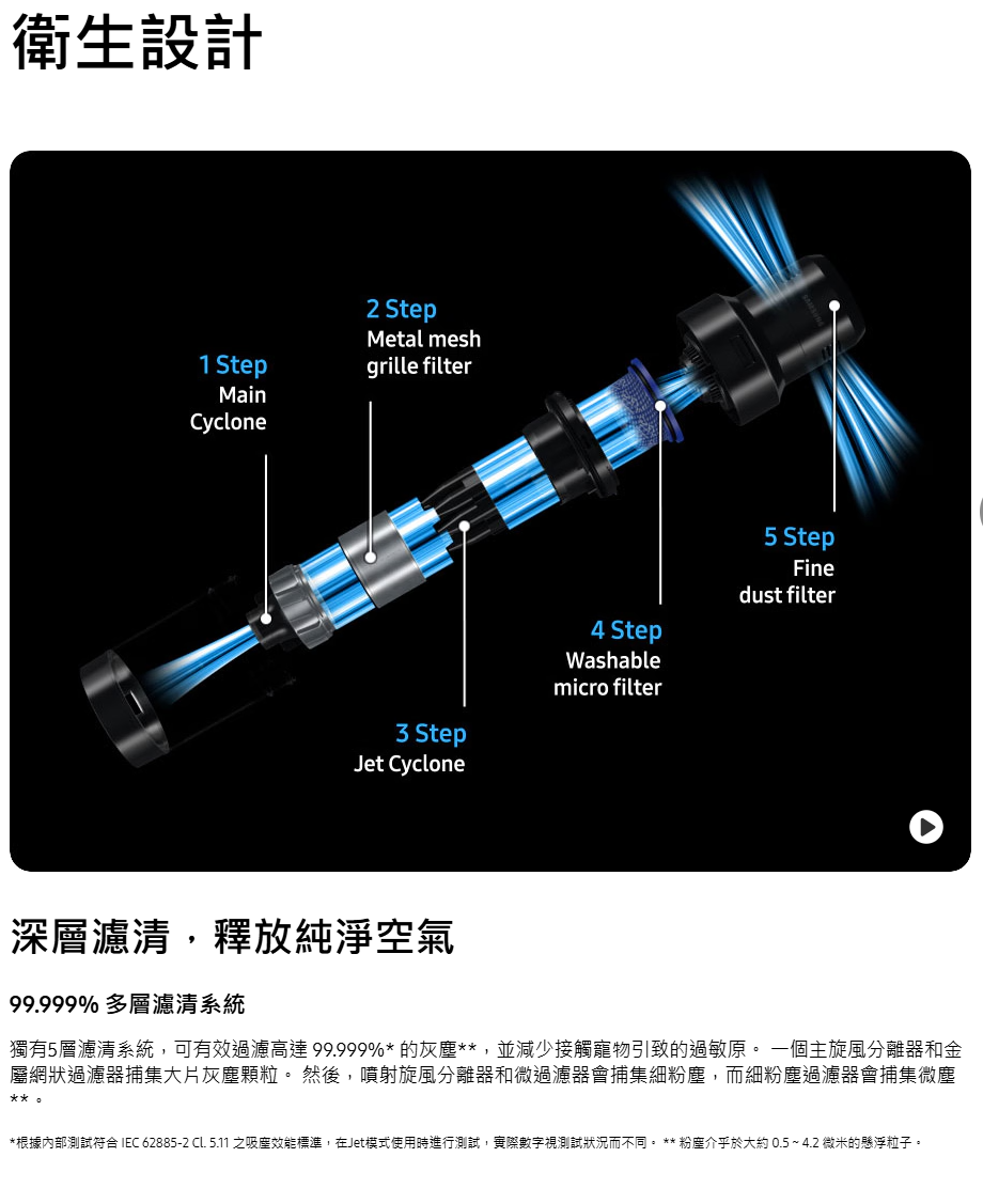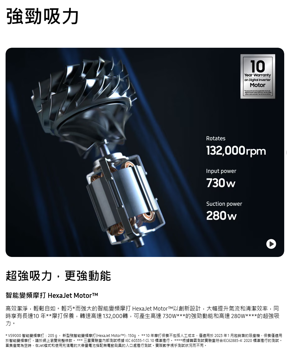 SAMSUNG VS28C979FQK/SP 最強勁的旋風吸塵機,讓你徹底清潔家居 。智能變頻摩打 HexaJet Motor™能產生高達 280 W 超強勁吸力,