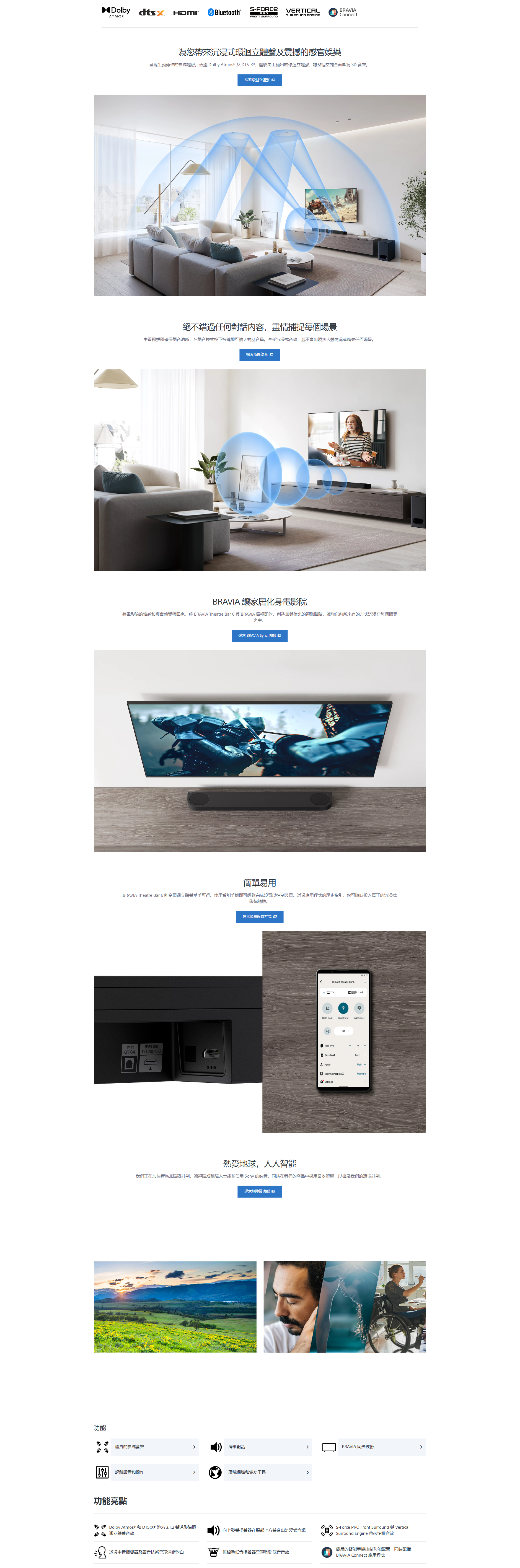 SONY BRAVIA Theatre Bar6 配備 3.1.2 聲道 Soundbar 專為觀影愛好者而設,配備 Dolby Atmos®、DTS® 及向上發聲揚聲器,