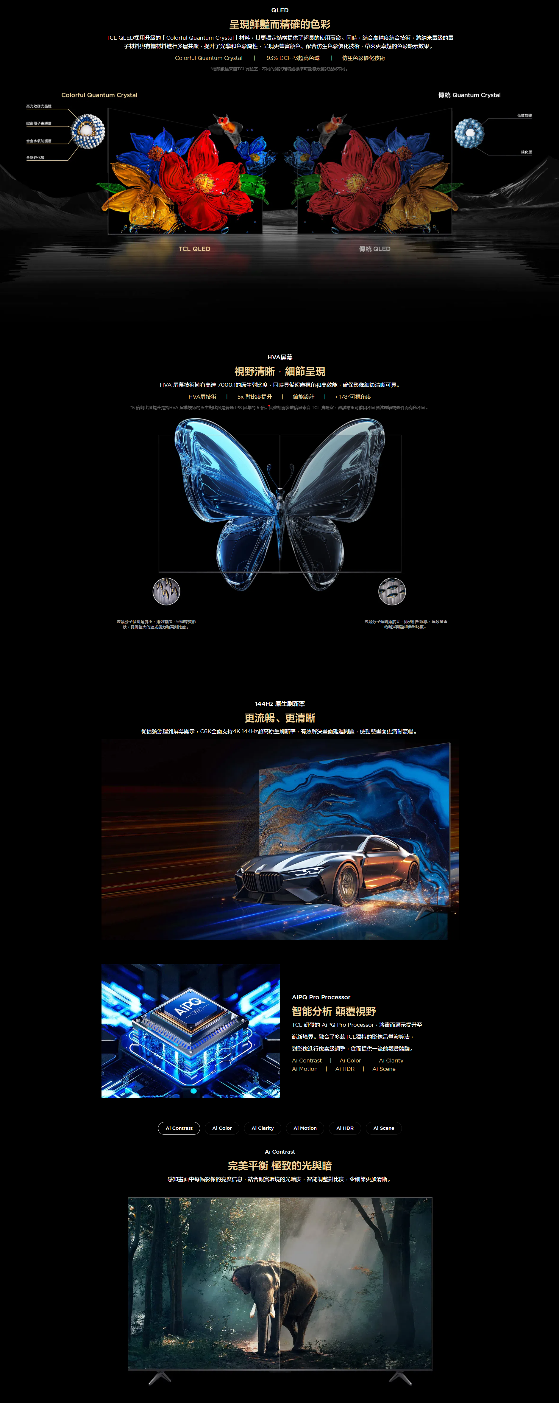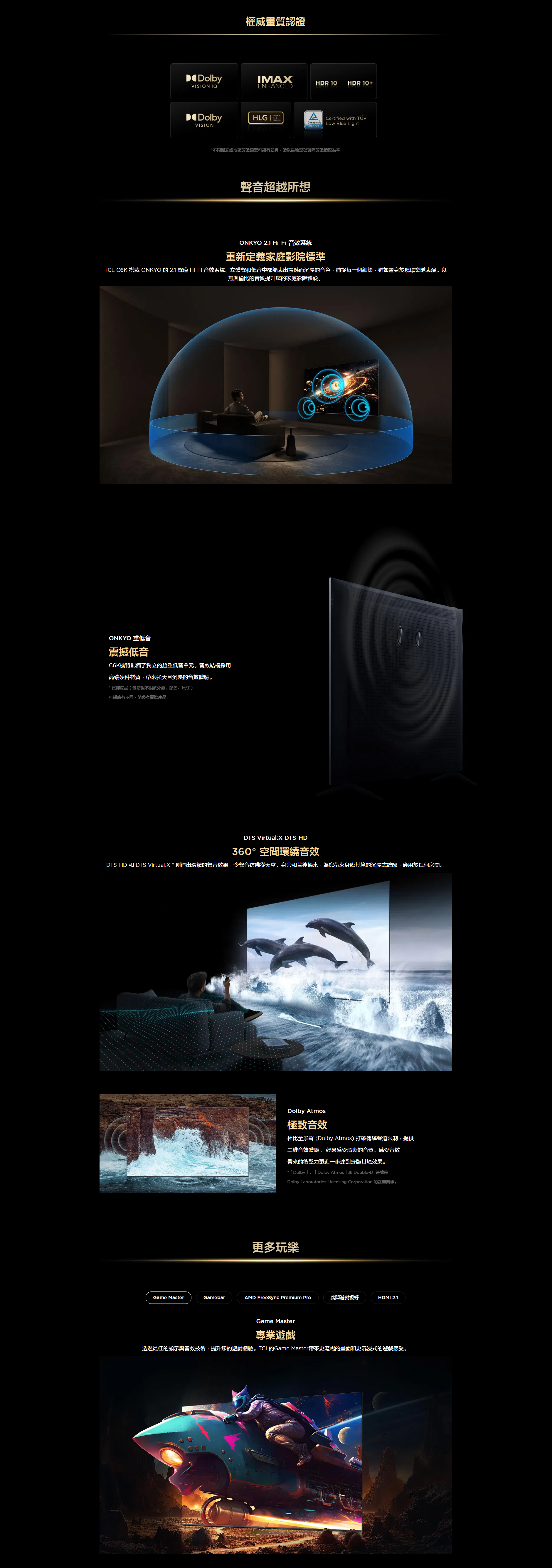 TCL C6K 全面支持4K 144Hz超高原生刷新率,有效解決畫面延遲問題,使動態畫面更清晰流暢。