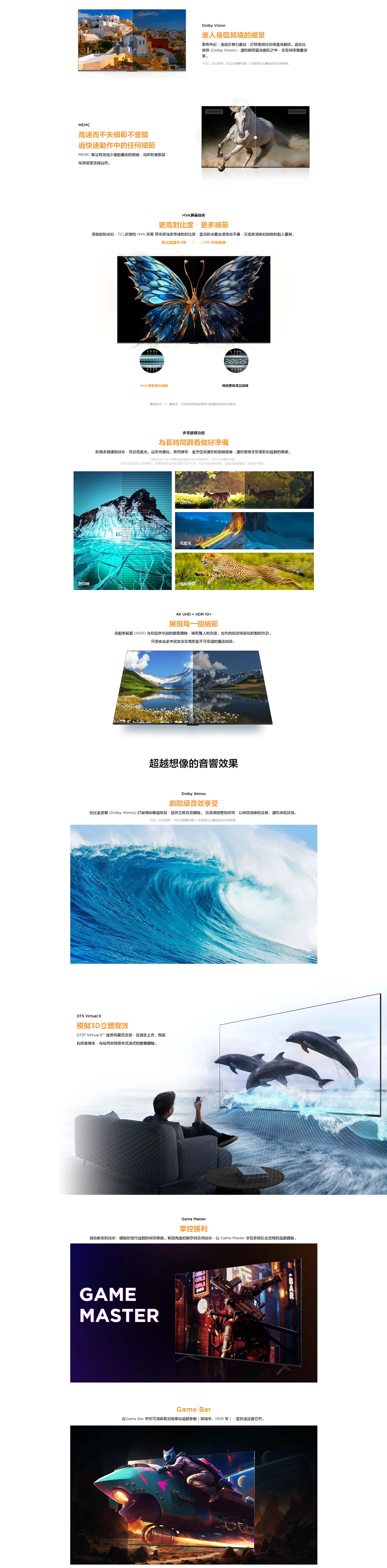TCL研發的 HVA 屏幕 帶來更強更準確的對比度,並消除光暈及環境光干擾,呈現更清晰和細緻的動人畫質。
