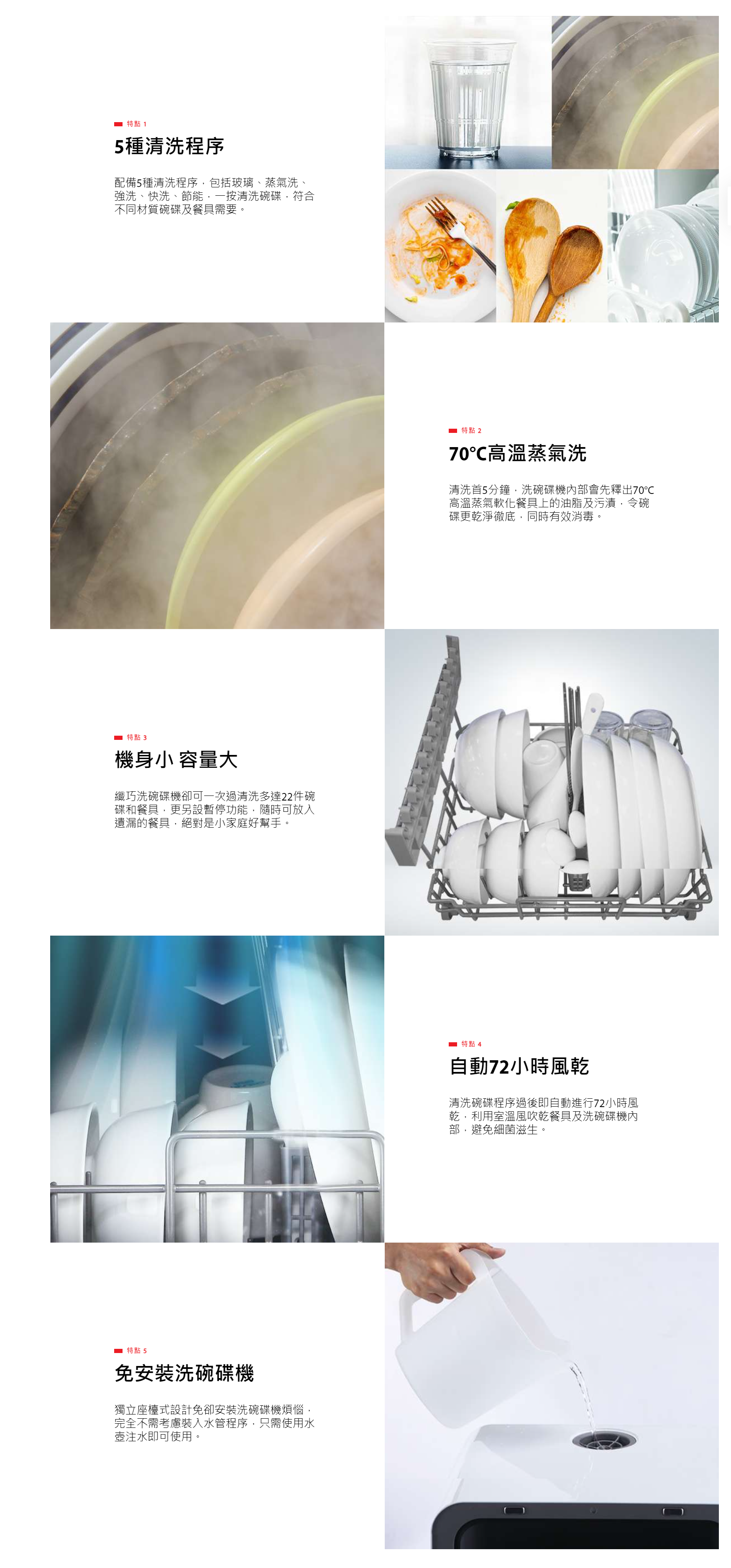 更特設70°C高溫蒸氣洗,有效分解油脂,清洗過程省時、省水、省力,清洗碗碟輕鬆快捷。