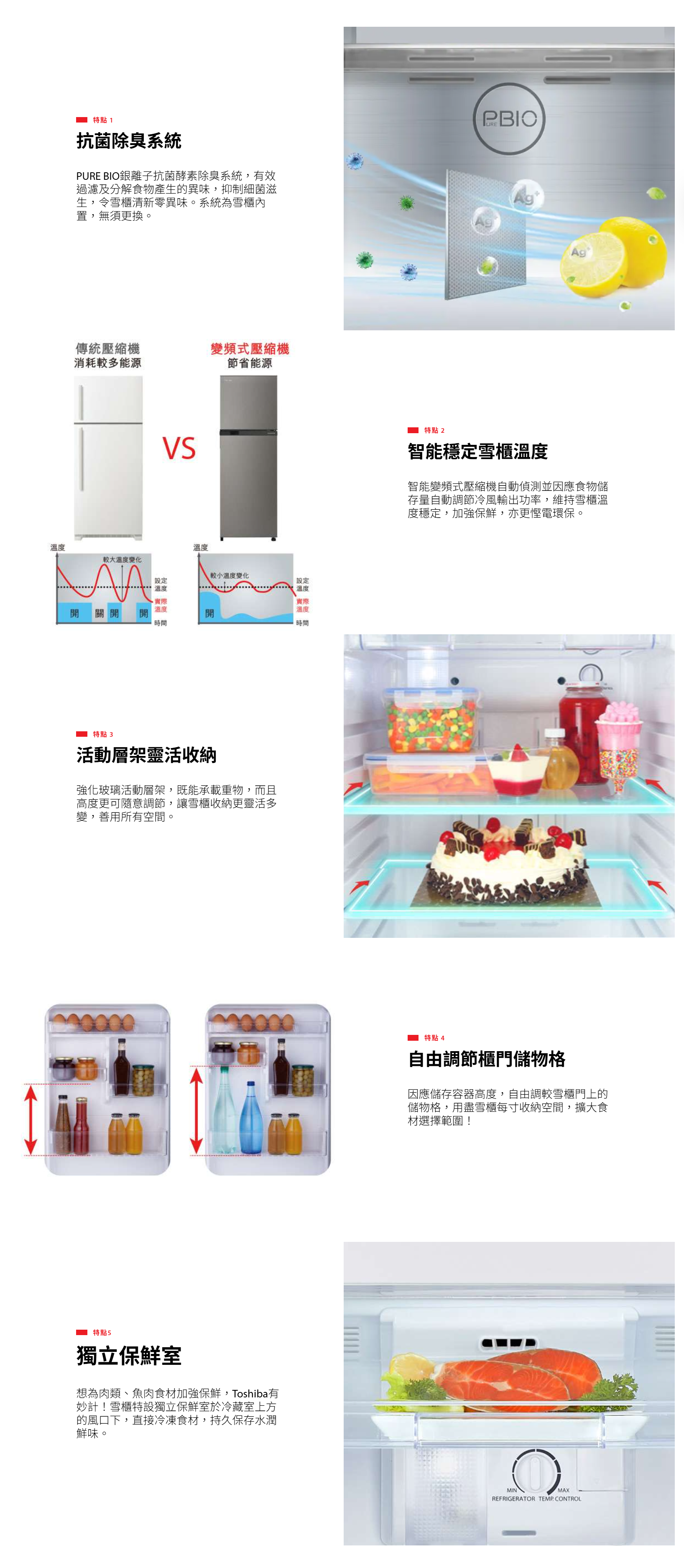 TOSHIBA 東芝 GR-RT300WE-PMA(57) 變頻上置式雙門雪櫃 233公升 ⭐全新香港行貨 , ⭐原廠 5 年全機及10年壓縮機保養🚚免費送貨及拆箱擺位(偏遠地區除外)⭐233L大容量雪櫃內設有活動式層架及櫃門儲物格,靈活實用,更特設旋轉式自動製冰格,單手輕鬆取冰,纖巧窄身適合香港細廚房,1級能源標籤每年耗電僅172kWh,省電環保。
