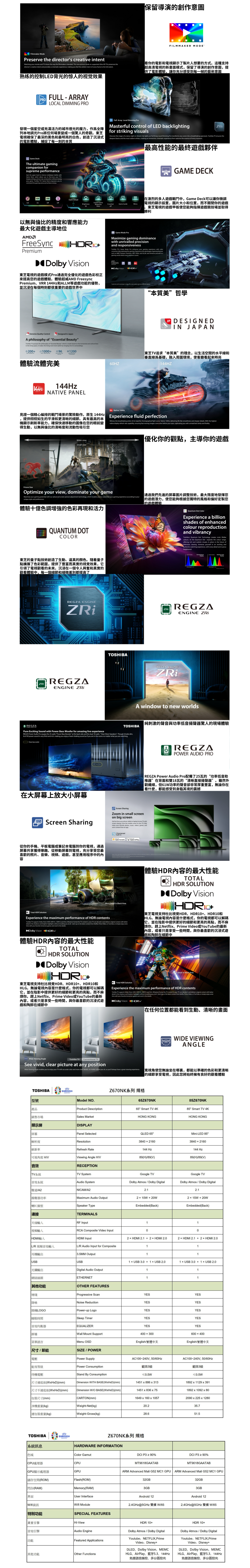 TOSHIBA 65Z670NK東芝全新 65吋 4K 144Hz QLED Google TV旗艦型號,