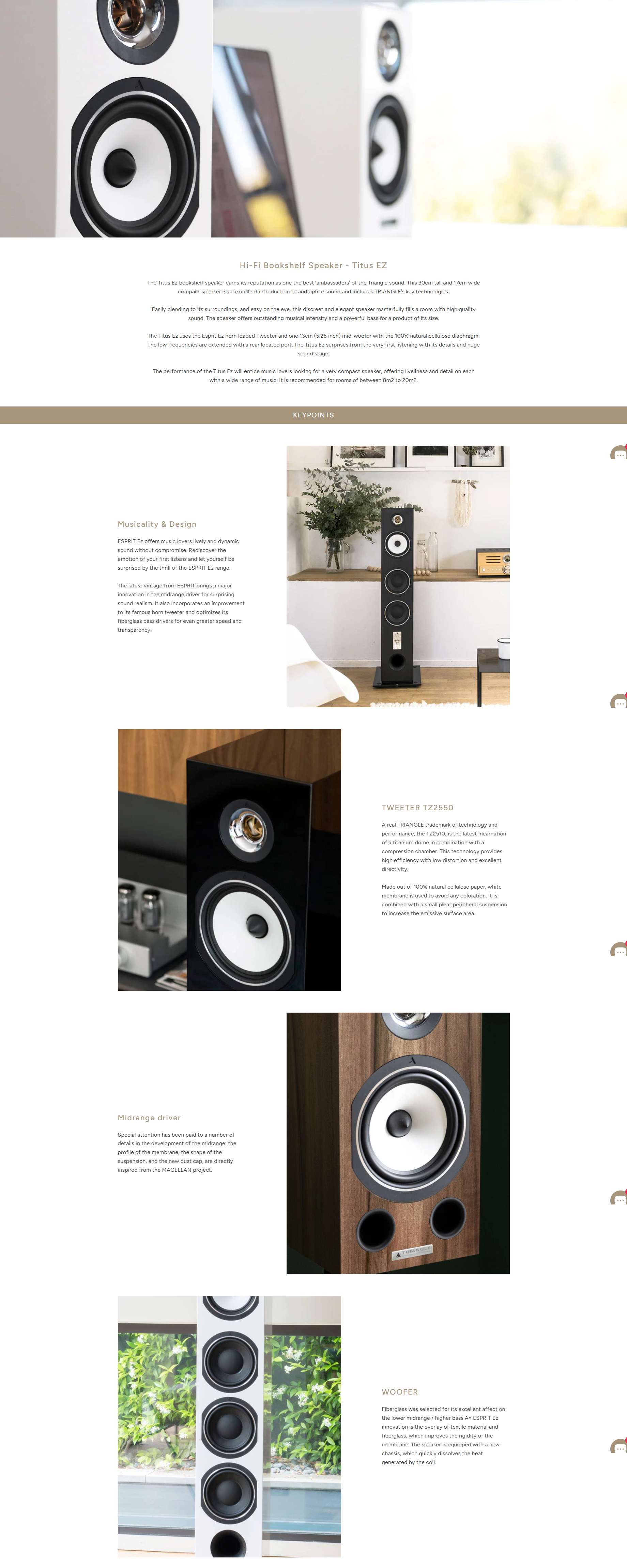 法國頂級音響的空間魔術!Triangle Esprit Titus EZ 兩路書架喇叭,擁有極致纖巧的箱體,卻蘊藏令人驚豔的龐大音場。配備與高階型號相同的 TZ2550 鈦金屬號角高音,以及 13cm 天然纖維中低音單元,為您帶來極具穿透力的高頻與自然真實的飽滿人聲。無論是書房桌面還是客廳角落,都能輕鬆融入香港狹小的居住環境。於 HD Life 網購,尊享⭐全新香港行貨 , 原廠一年保養⭐🚚免費送貨 ( 偏遠地區除外 )⭐