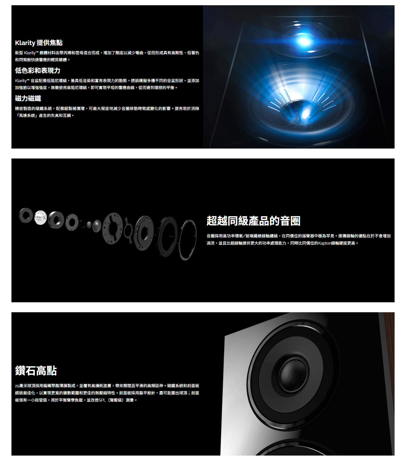 帶來有力且細緻的中低頻;25mm(1 吋)半球高音則提供開闊且順滑延伸的高頻。